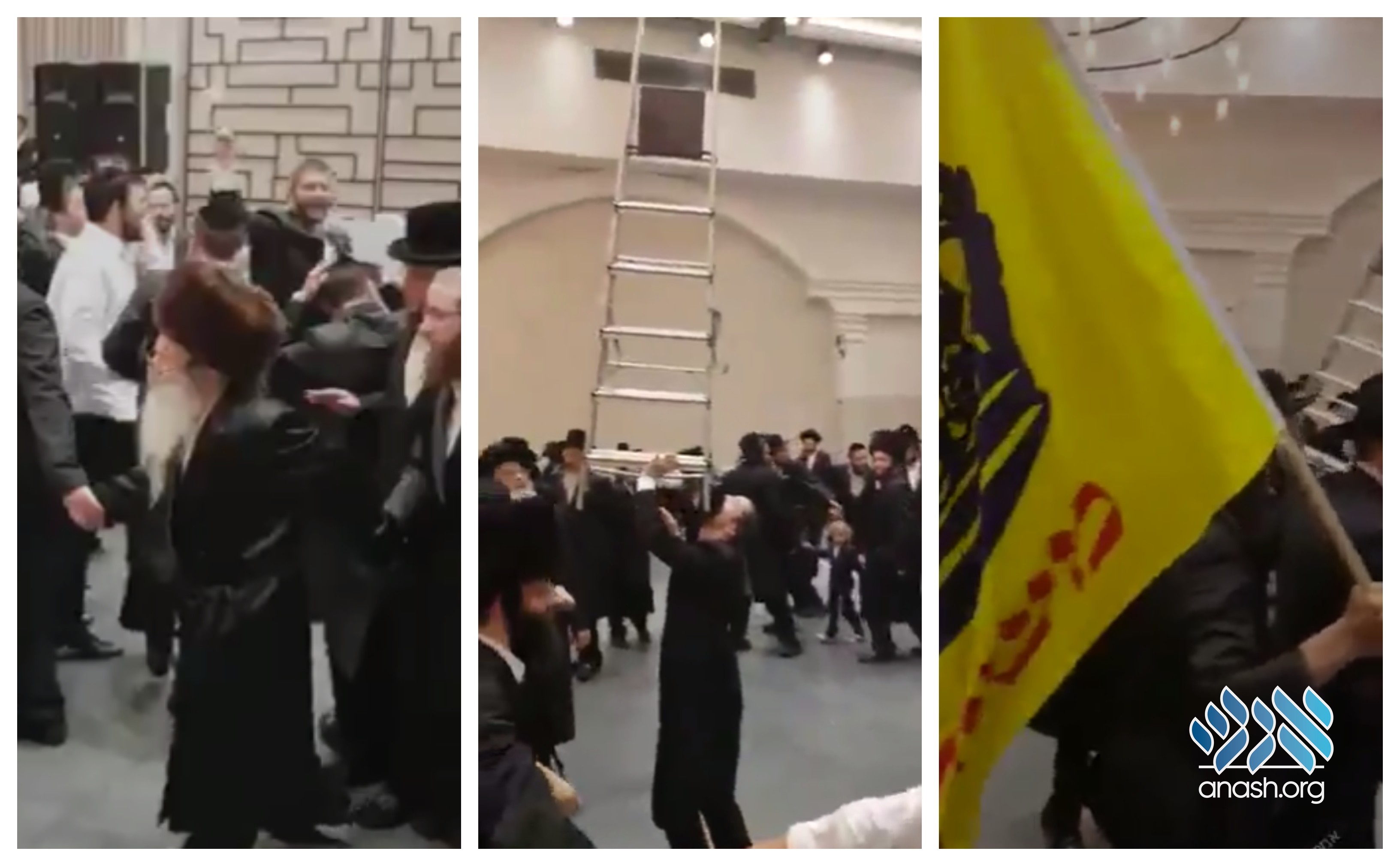 The chosson is a nephew of the Amshinover Rebbe. The kalla is a Lubavitcher with a Yemenite background. The result was the rebbe and chosson dancing together in spodiks to the tune of Yemenite music, while Moshiach flags could be seen among the crowd.