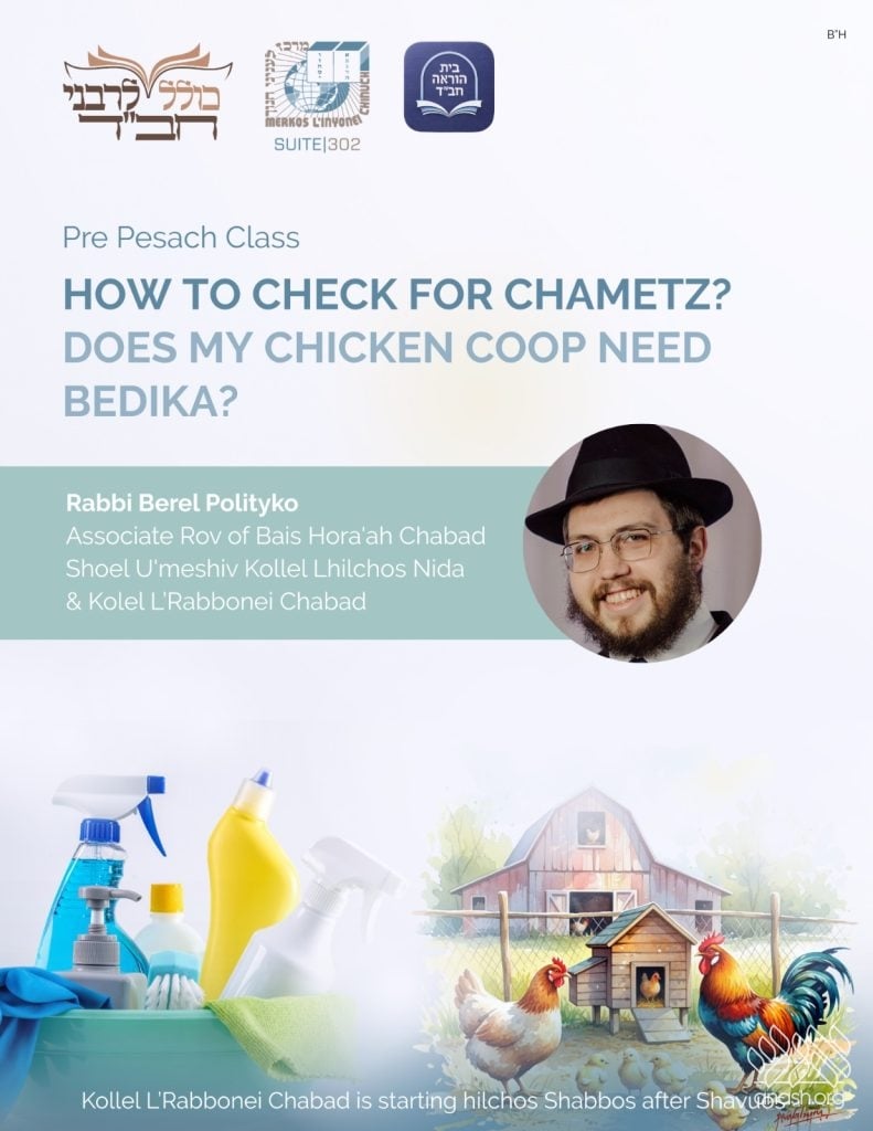 In a pre-Pesach shiur, Rabbi Berel Polityko, Associate Rov of Bais Hora’ah Chabad and shoel umeshiv at Kollel L’Rabbonei Chabad, will tackle questions relevant to practical bedikas chametz.