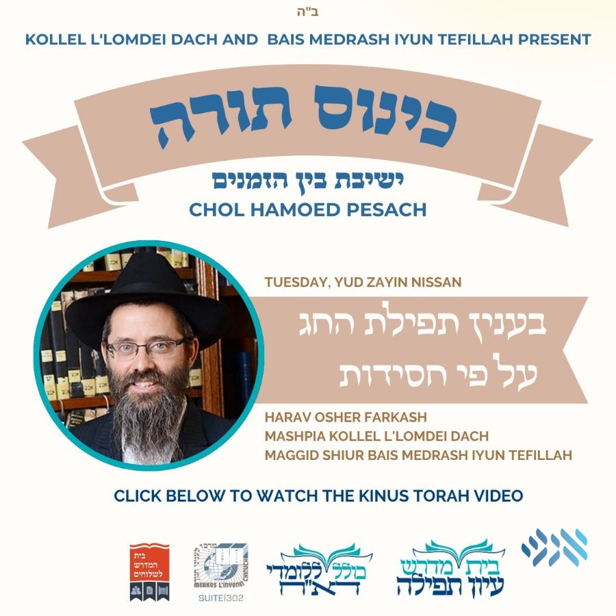 Bais Medrash Iyun Tefila and Kollel L’lomdei Dach present a special Chol Hamoed shiur on the topic of Yom Tov davening according to Chassidus by Reb Osher Farkash.