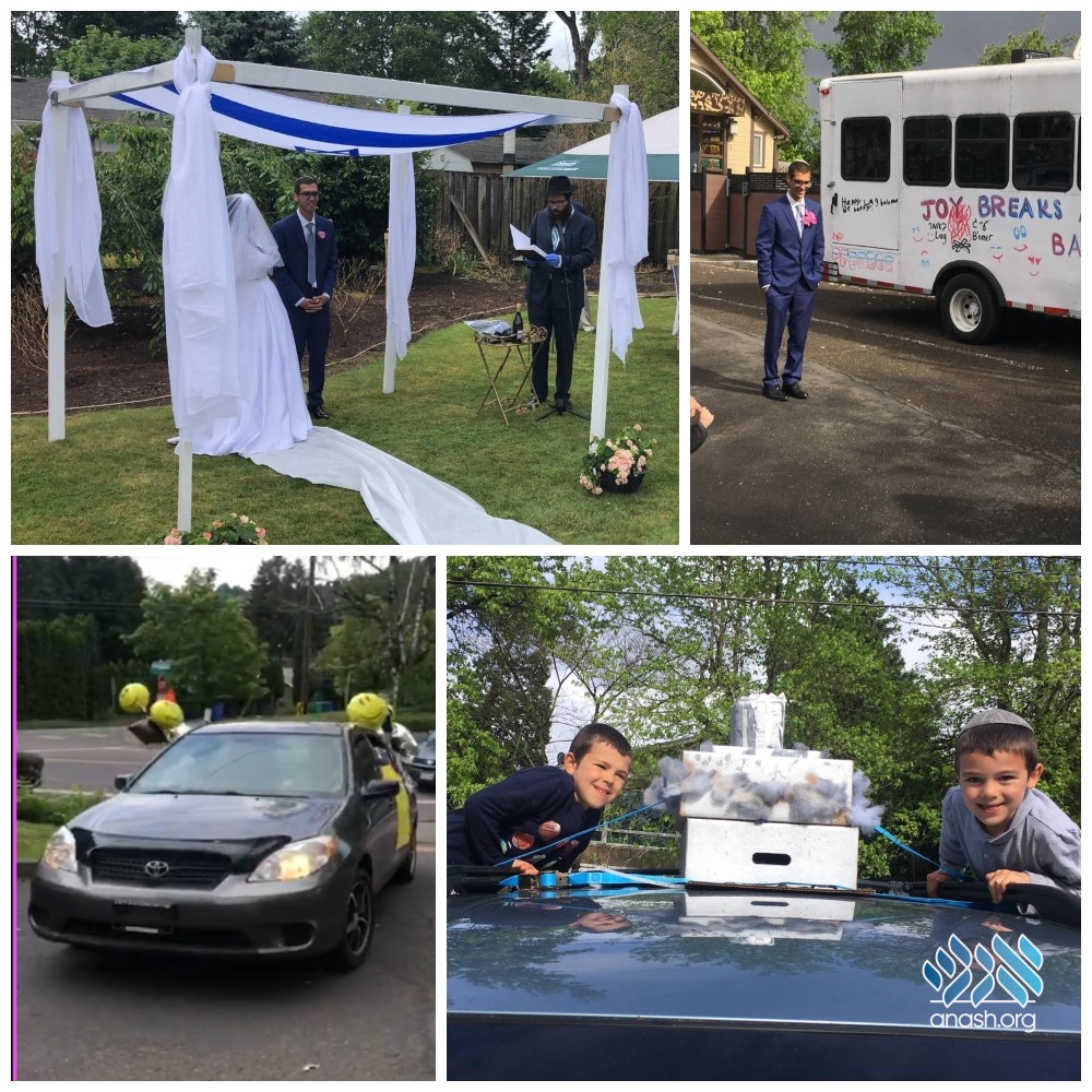 Due to social-distancing regulations, the wedding was attended by only a minyan which included local shluchim, and was officiated by Rabbis Chayim Mishulovin and Menachem Rivkin.