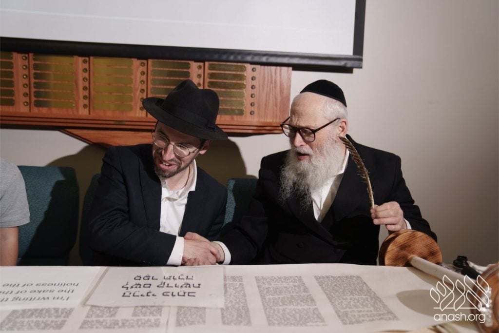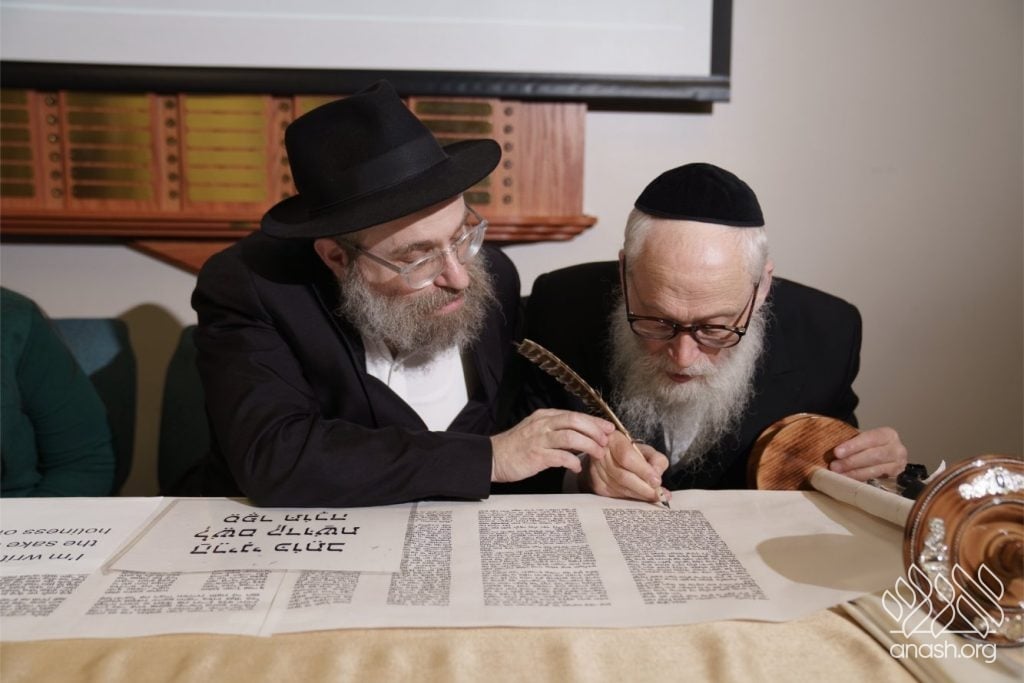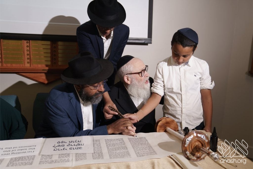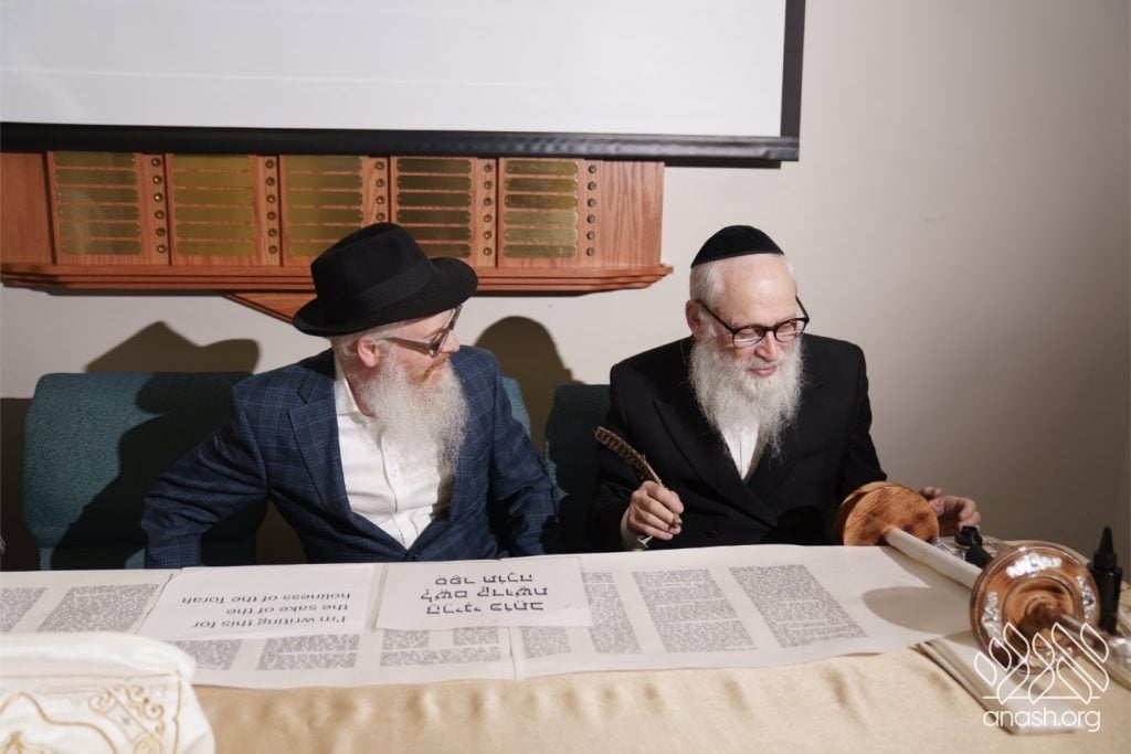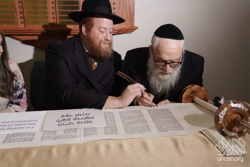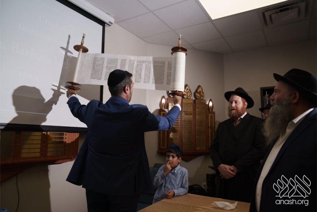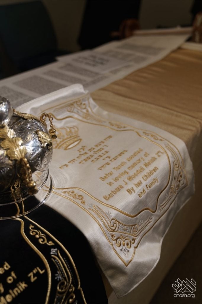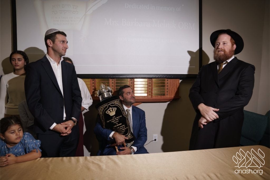 The Sefer Torah was dedicated by the Melnik family in memory of their mother, Barbara Melnik, by her children Ryan, Ilan, and Irit. The event began with the writing of the final letters by the sofer, Rabbi Moshe Klein of Brooklyn, with families stepping up to assist, holding the quill together with the sofer.