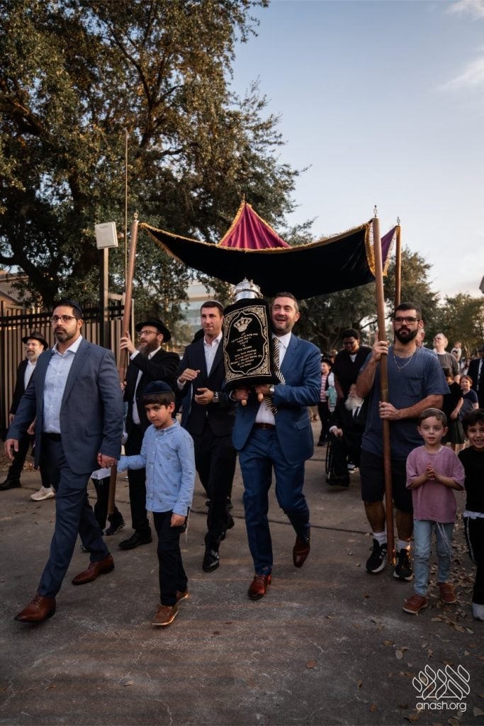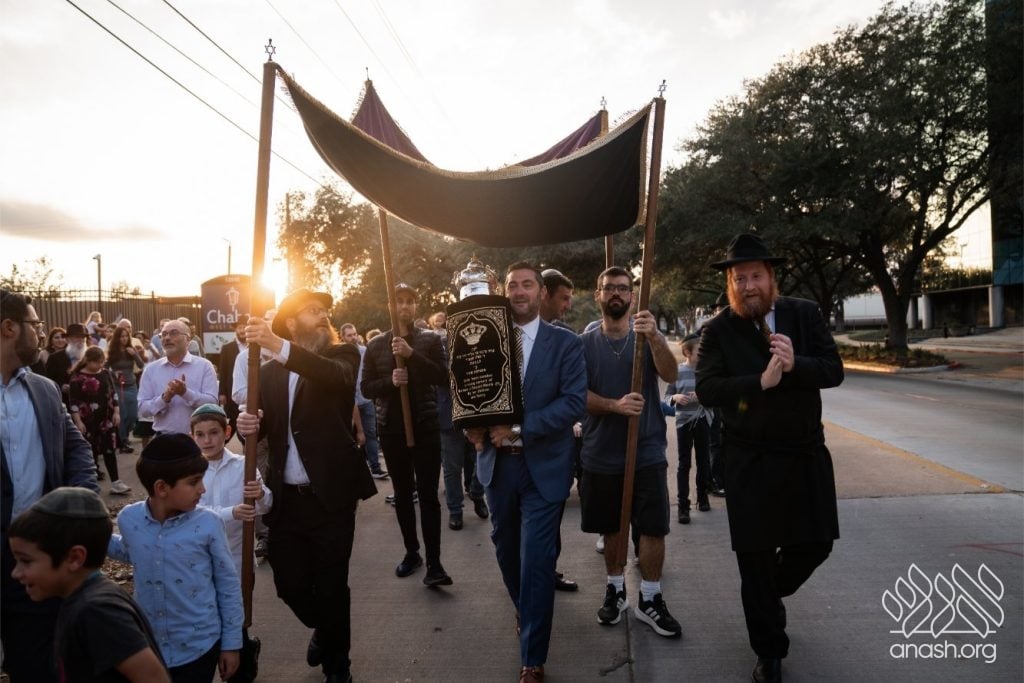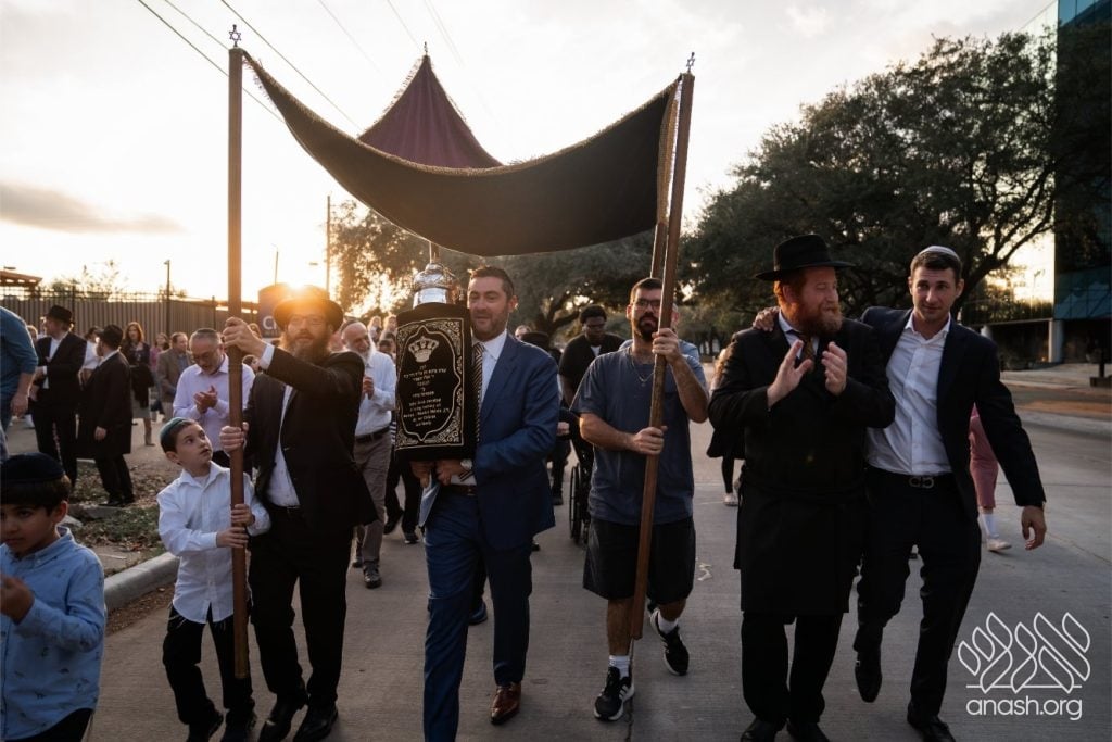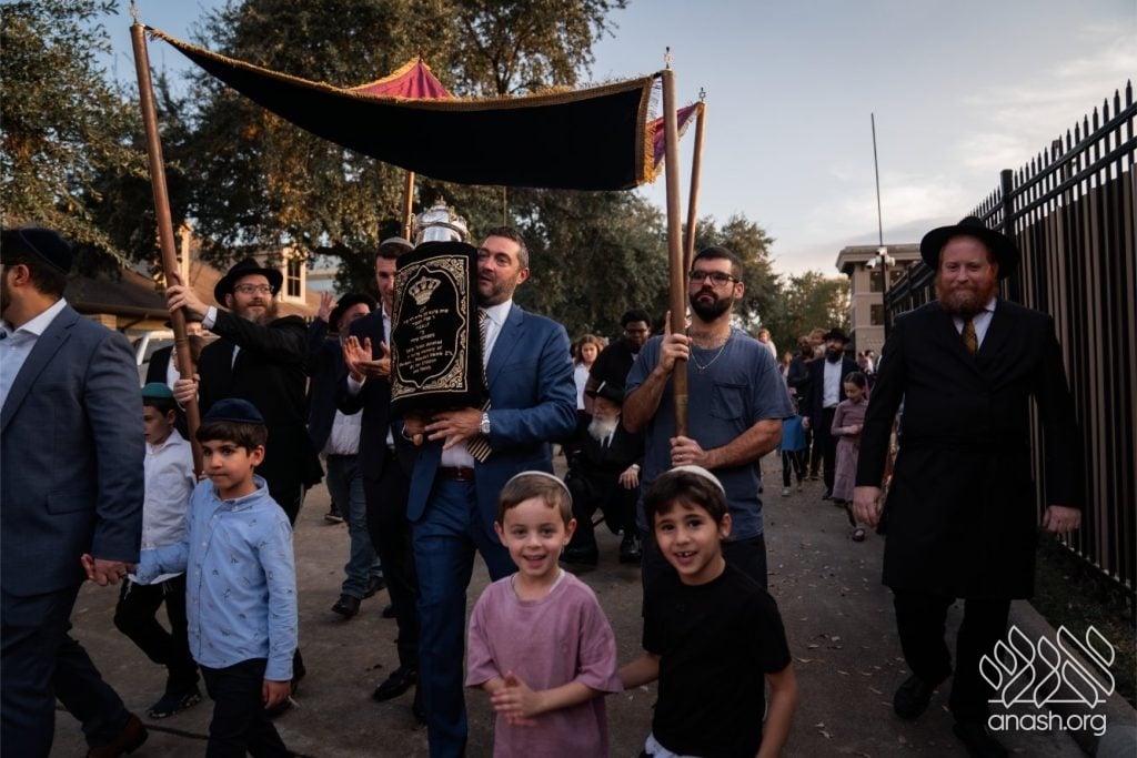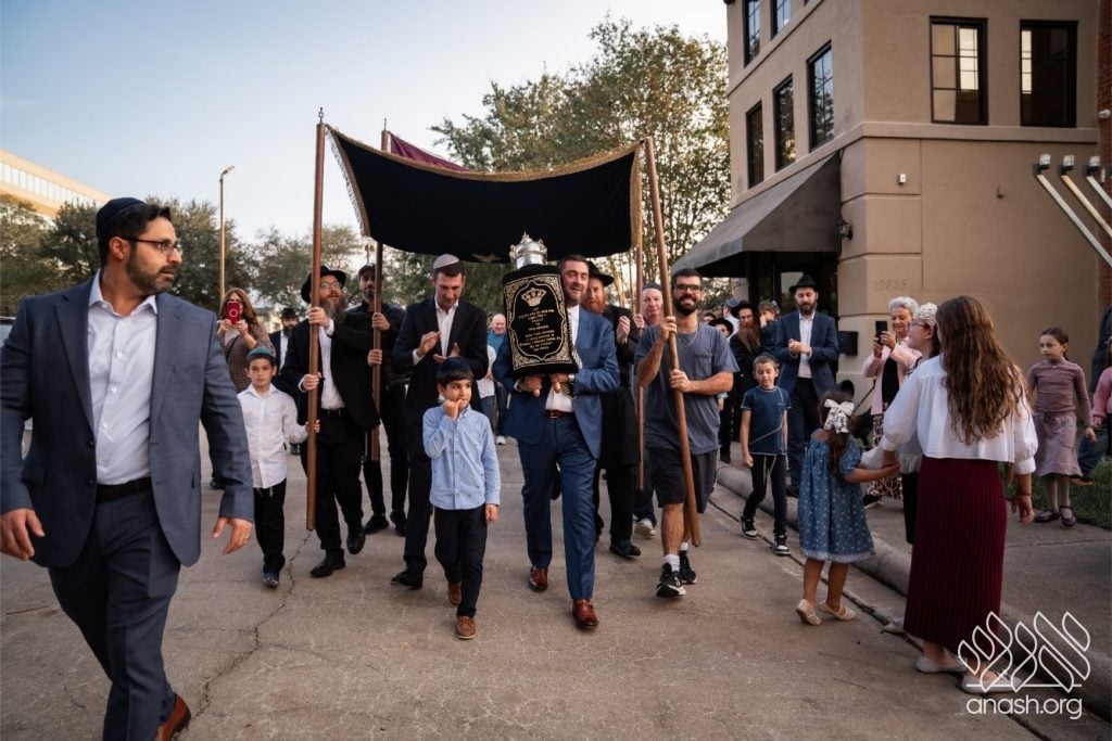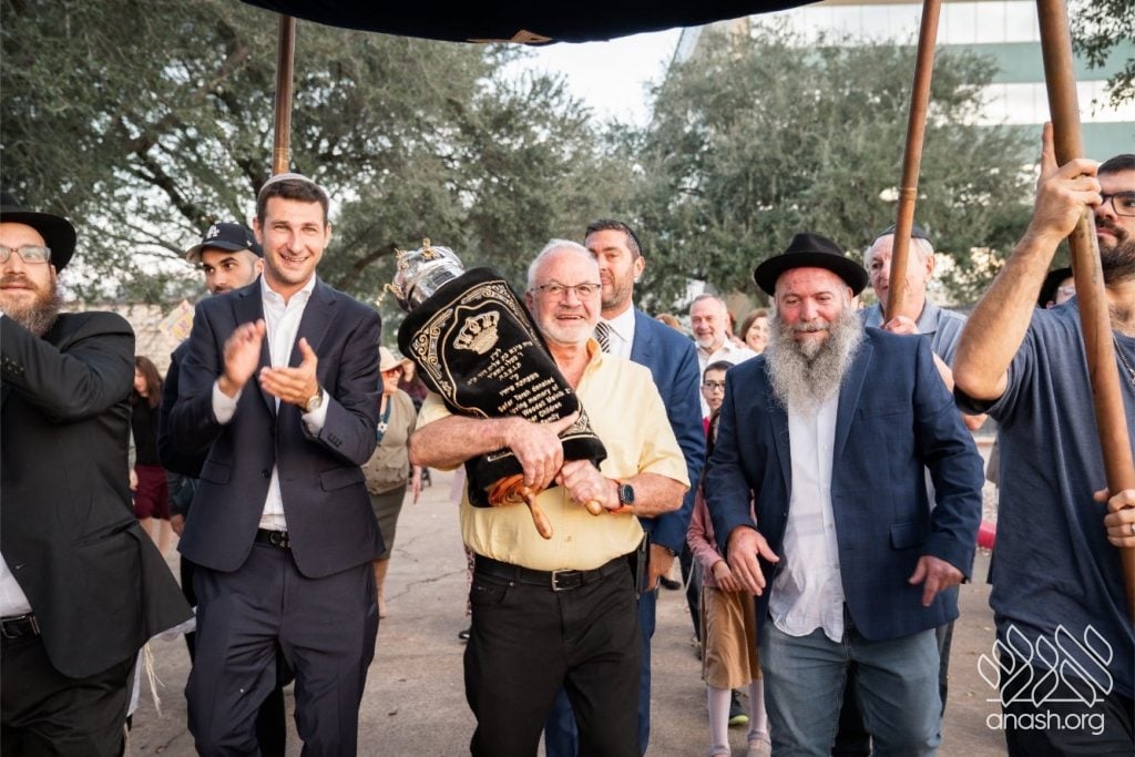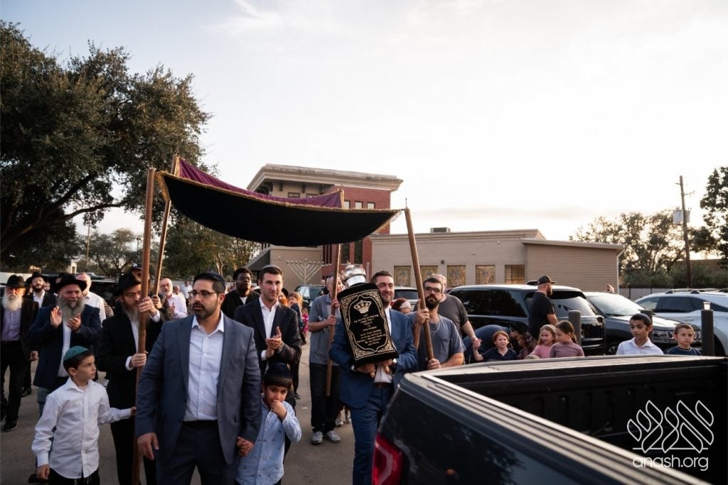 The Torah was lifted for all to see in hagbah, then dressed in its mantle and crown. The crowd broke into lively dancing as the Sefer Torah was escorted outside. With music, singing, and hakafos, a chuppah was held above the new Torah as it was brought through West Houston and into its new home in the Aron Kodesh at Chabad of West Houston.