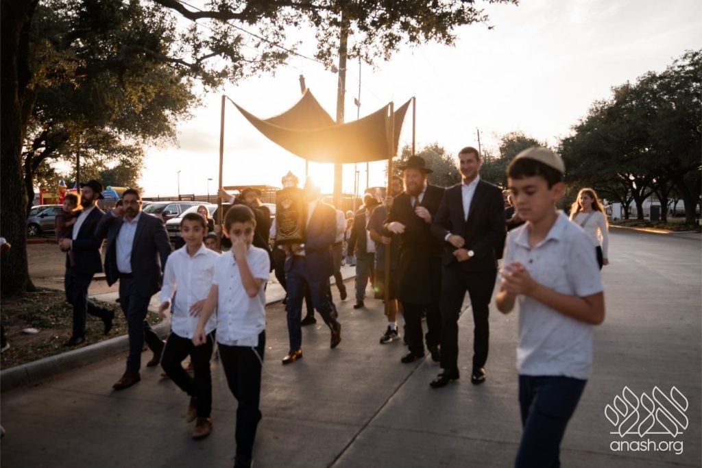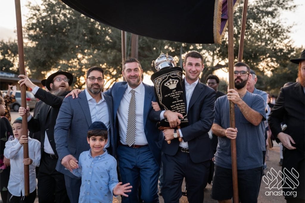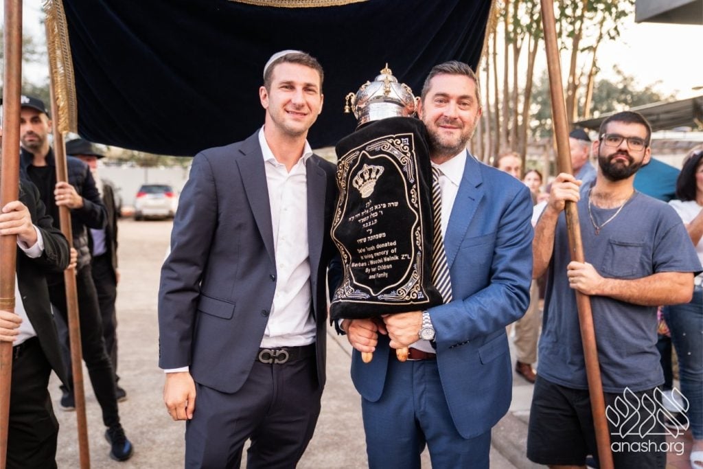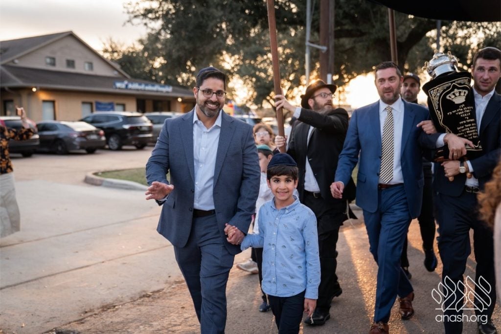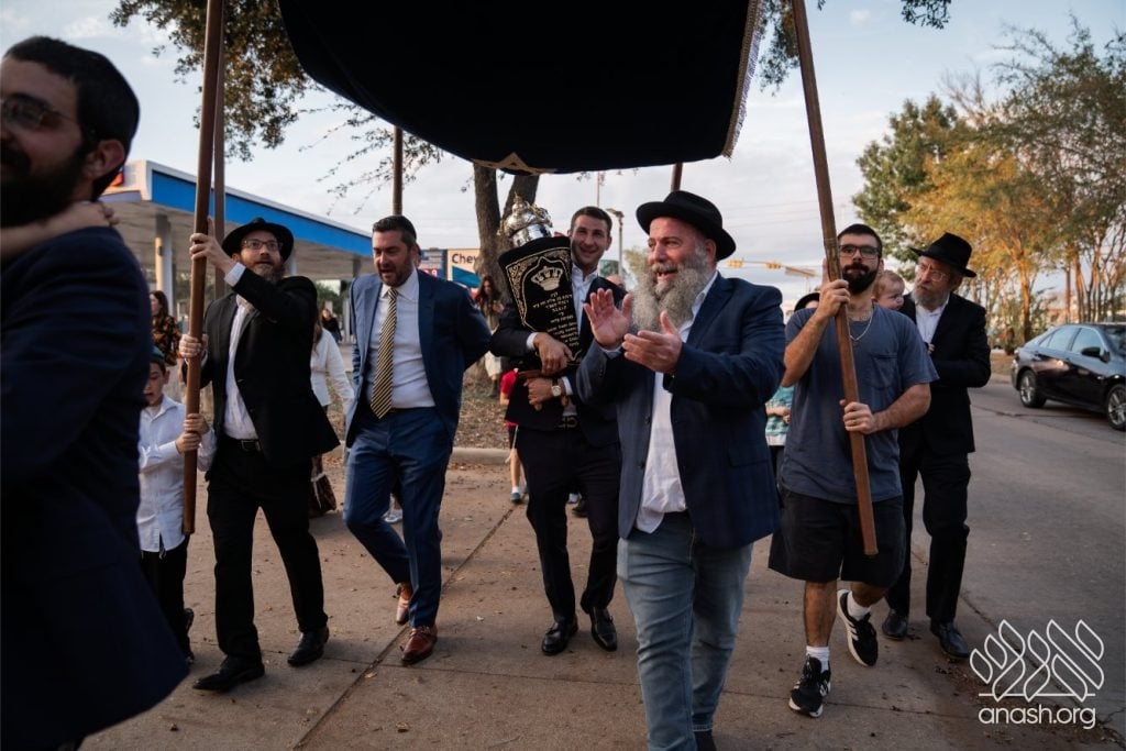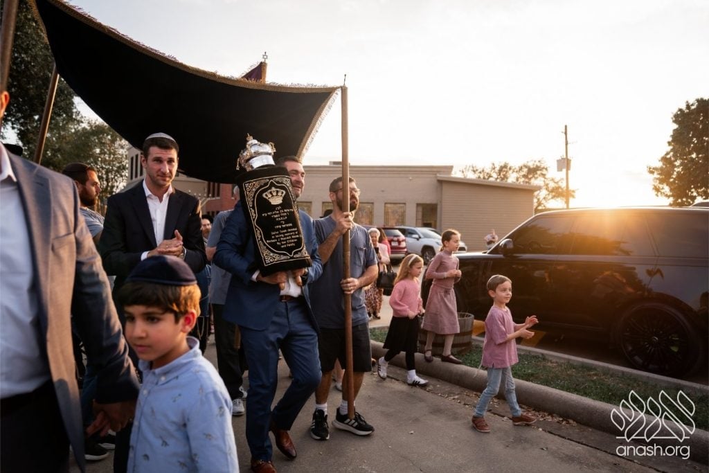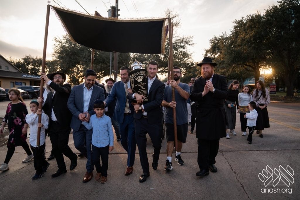 The Torah was lifted for all to see in hagbah, then dressed in its mantle and crown. The crowd broke into lively dancing as the Sefer Torah was escorted outside. With music, singing, and hakafos, a chuppah was held above the new Torah as it was brought through West Houston and into its new home in the Aron Kodesh at Chabad of West Houston.