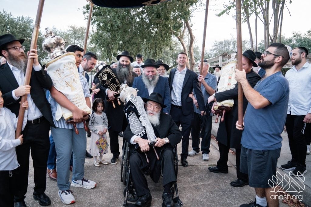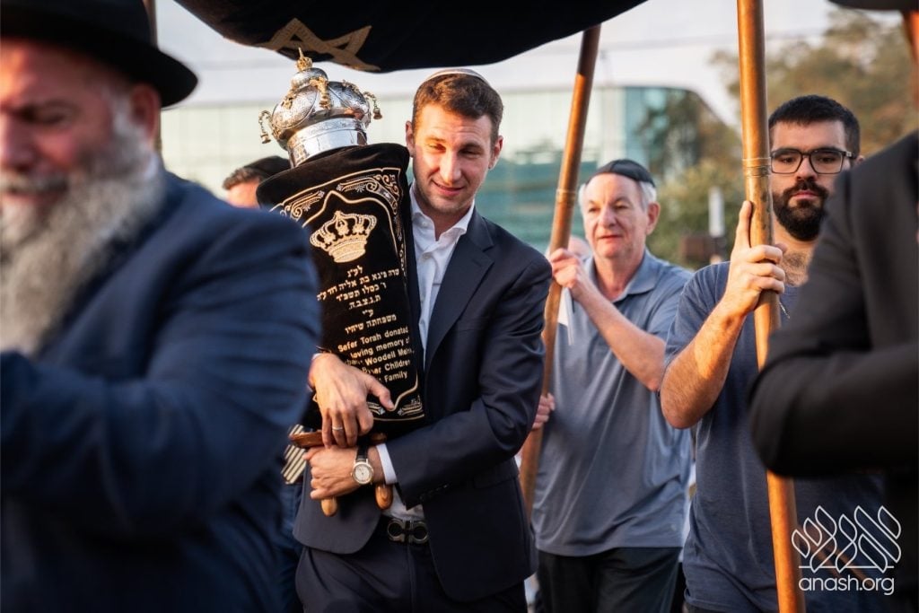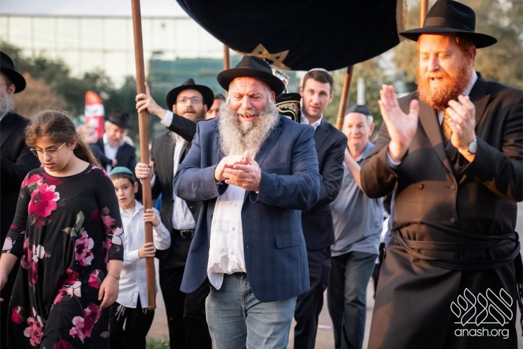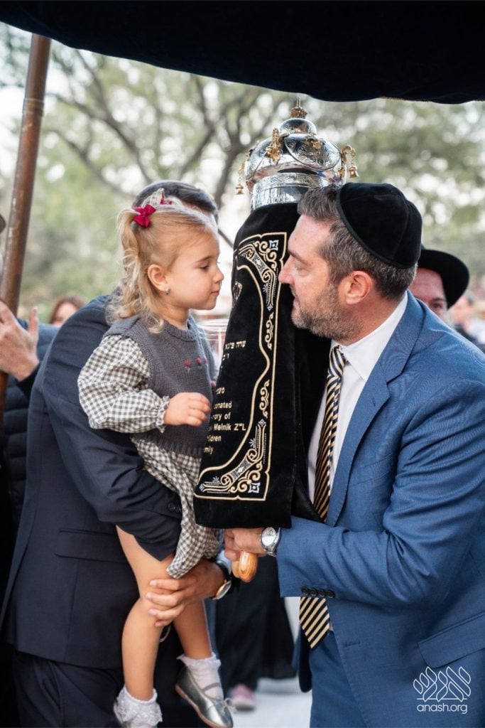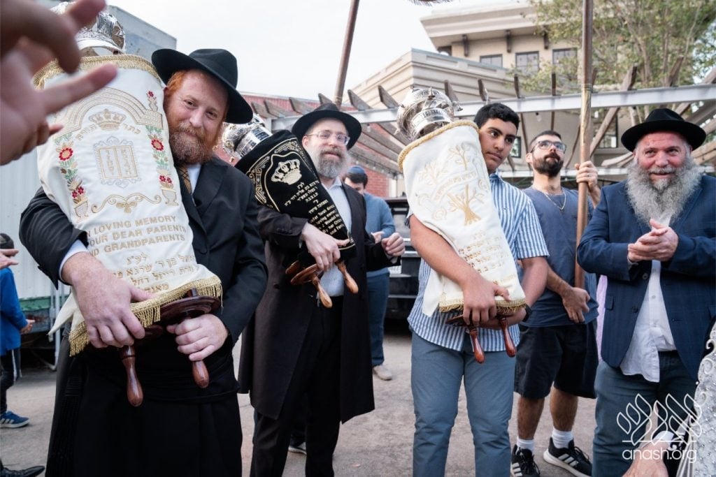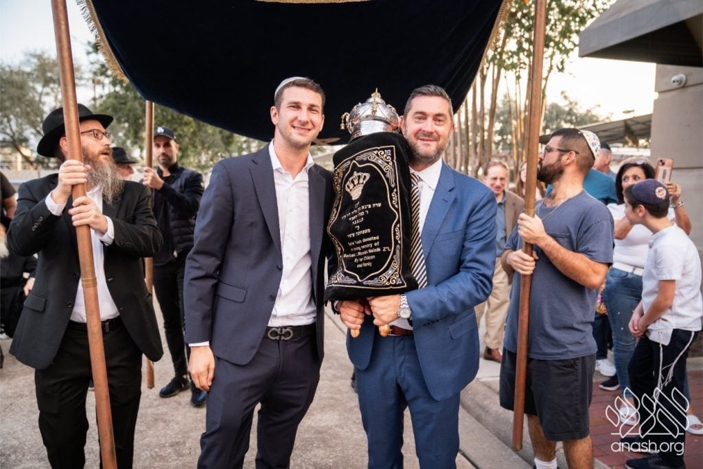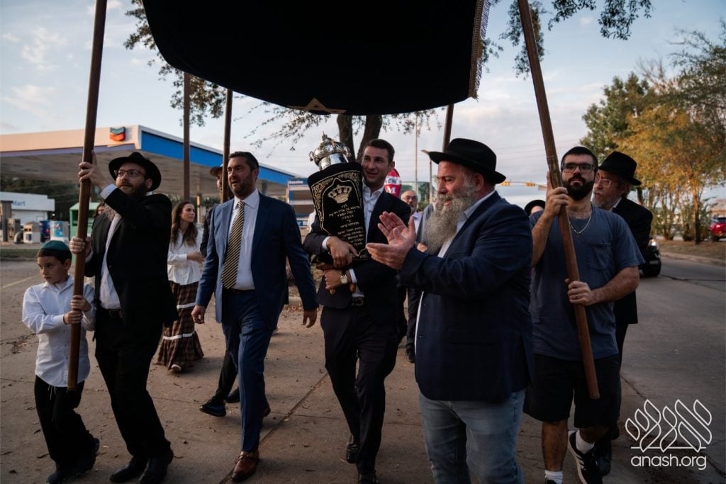 The Torah was lifted for all to see in hagbah, then dressed in its mantle and crown. The crowd broke into lively dancing as the Sefer Torah was escorted outside. With music, singing, and hakafos, a chuppah was held above the new Torah as it was brought through West Houston and into its new home in the Aron Kodesh at Chabad of West Houston.