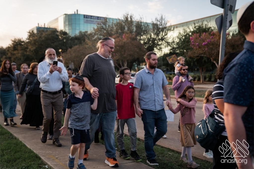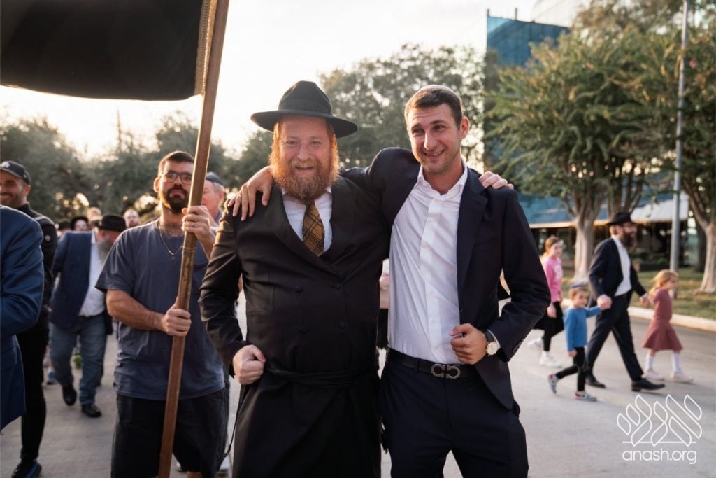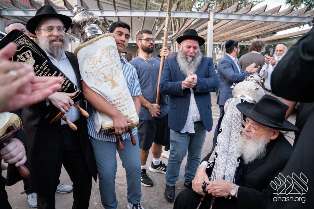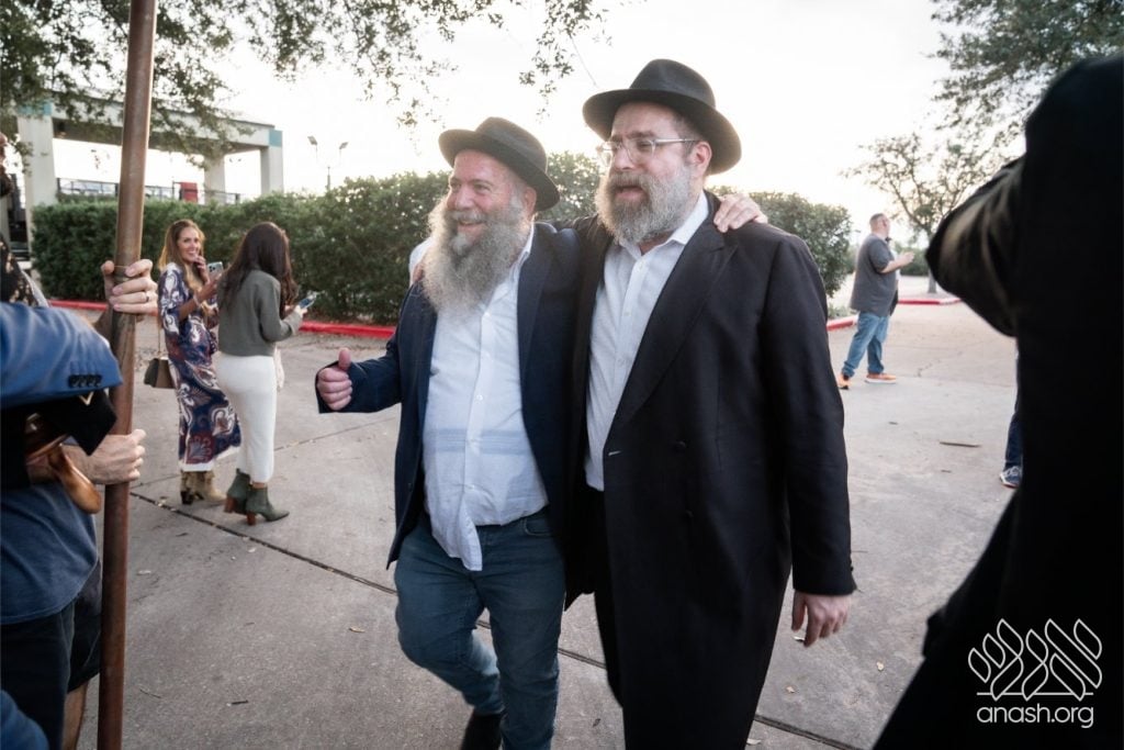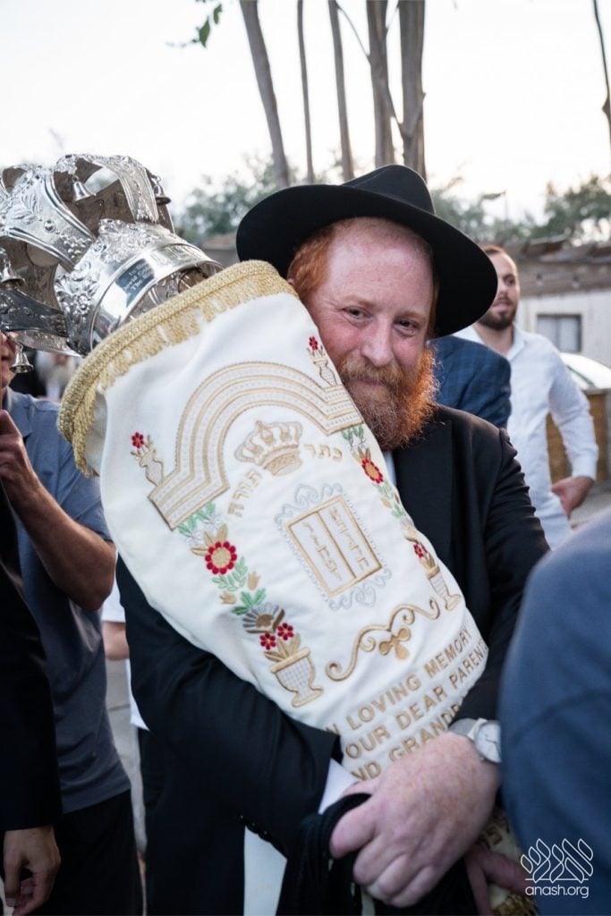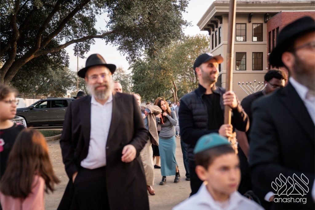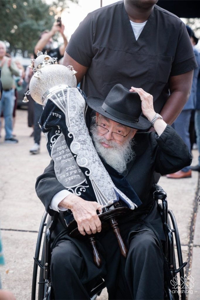 The Torah was lifted for all to see in hagbah, then dressed in its mantle and crown. The crowd broke into lively dancing as the Sefer Torah was escorted outside. With music, singing, and hakafos, a chuppah was held above the new Torah as it was brought through West Houston and into its new home in the Aron Kodesh at Chabad of West Houston.
