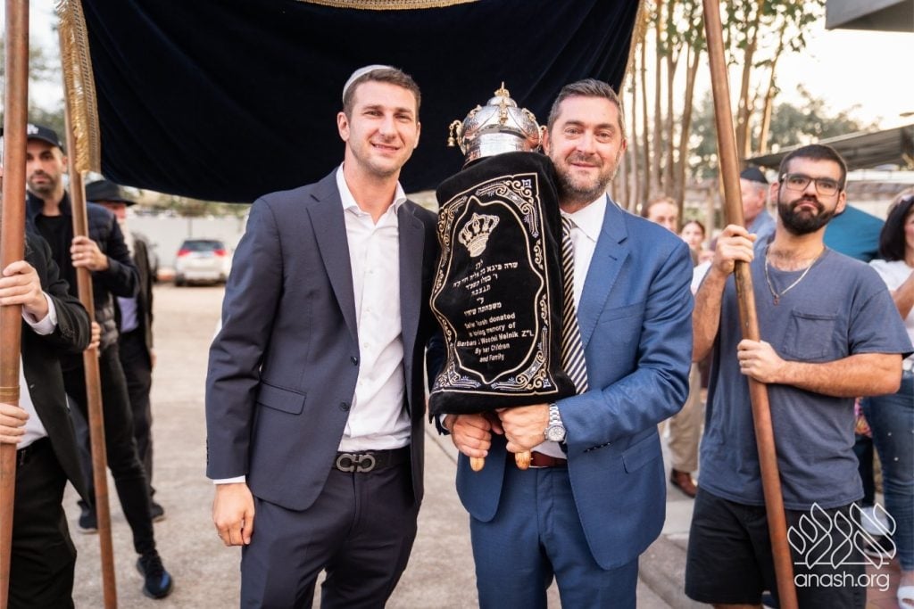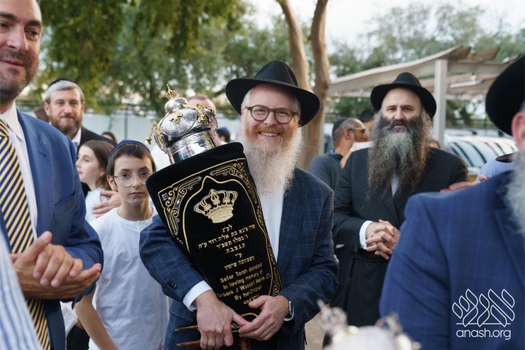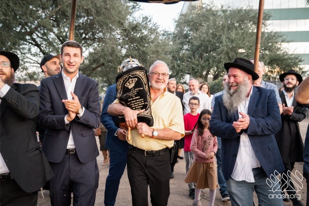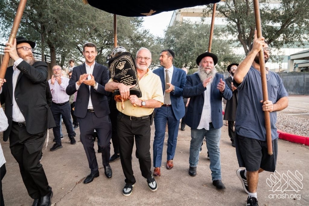 The wider Houston community celebrated a new Sefer Torah at Chabad of West Houston, where they joined to write the final letters and celebrate with spirited hakafos, music, and a festive seudah.