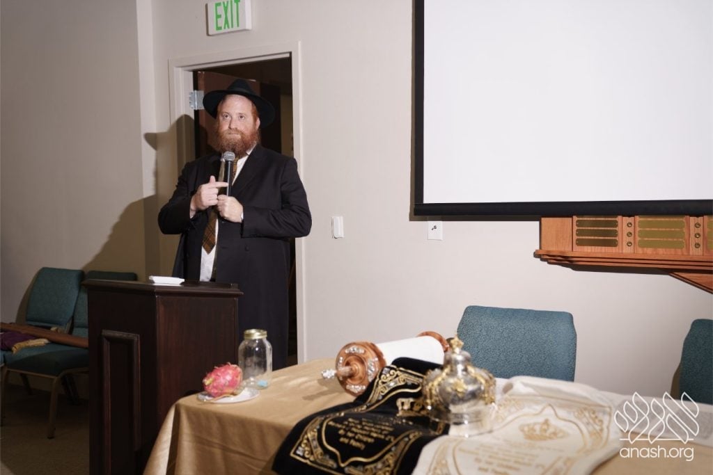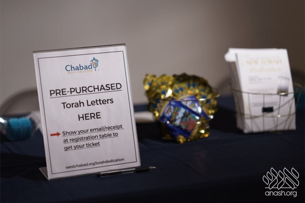 Rabbi Dovid Goldstein welcomed the wider Houston community and shared the Rebbe’s teaching that all Jews unite through a collective Sefer Torah, explaining that every person is like one letter, and if even one letter is missing or incomplete, the entire Torah is invalid. He also noted the 613th mitzvah of writing a Torah, and how purchasing a letter is a way to take part in that mitzvah.