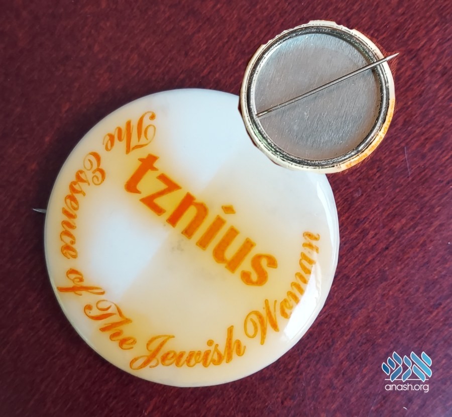 At that time, pin-back buttons were a popular method of spreading ideas. The leaders of Nshei Chabad, therefore, decided to create a button that would carry that message. With the Rebbe’s approval, the buttons bearing the phrase “Tznius, The Essence of The Jewish Woman.”