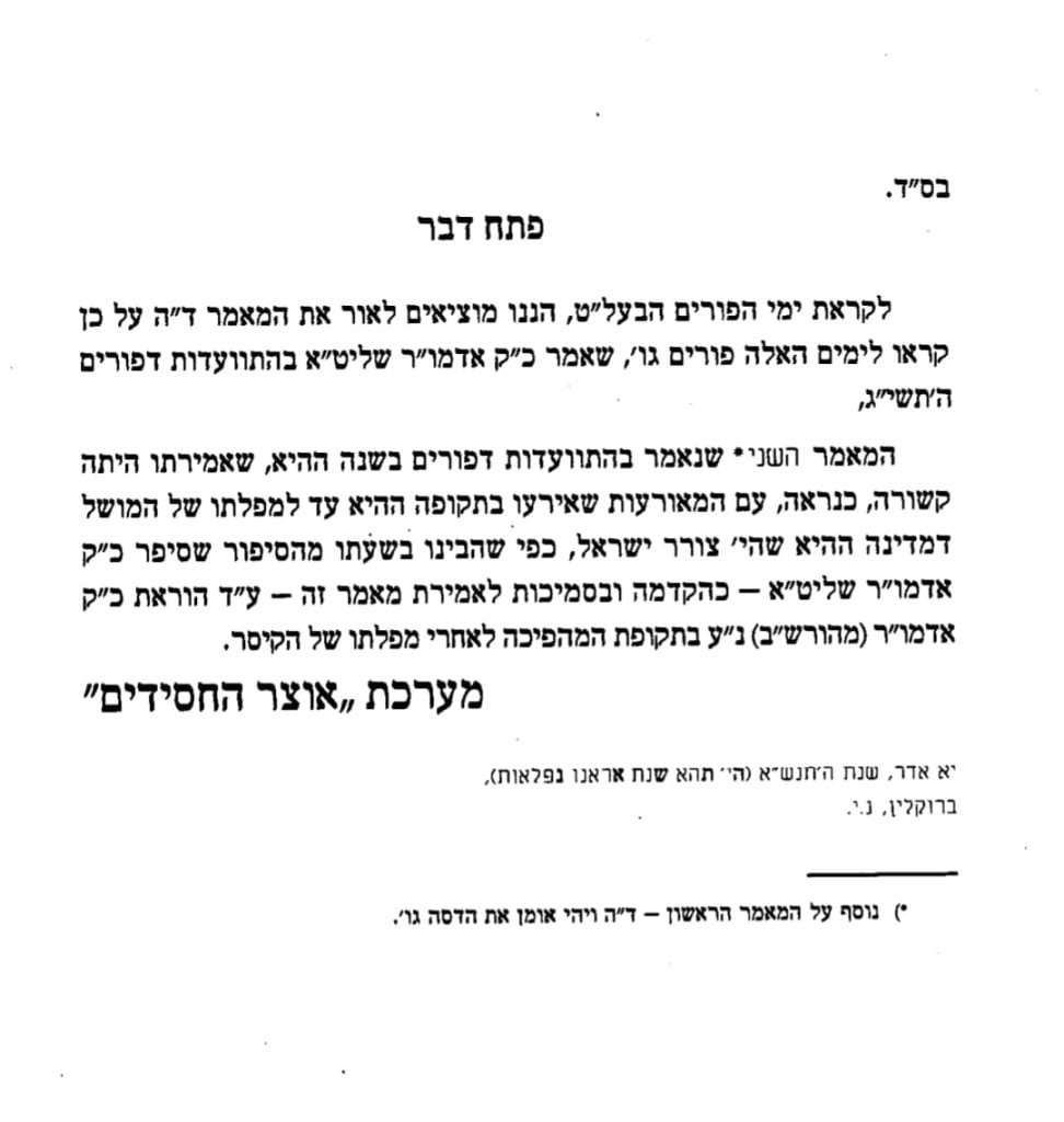 Decades later, in 5751, the Rebbe published that very maamar in an edited version. The date chosen by the Rebbe in the foreword: Yud-Alef Adar.