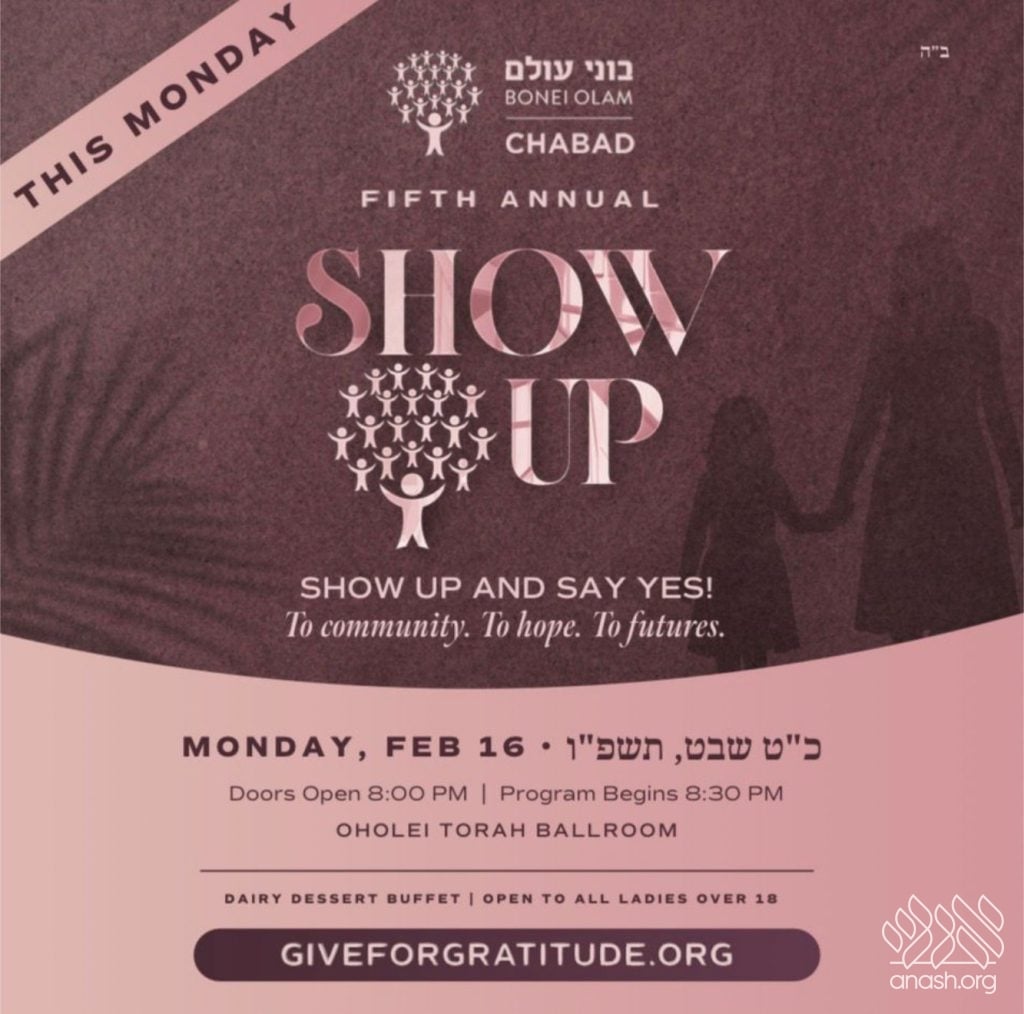 This Monday night, women from across our community will gather for the annual Women’s Bonei Olam Chabad Show Up Event. A night dedicated to standing together for our community, for hope, and for futures not yet born.