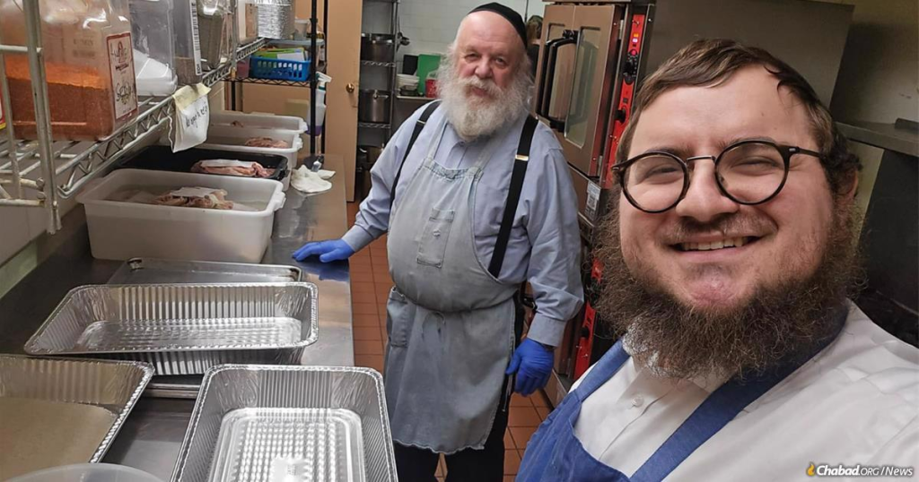 In the Lubavitch House commercial kitchen, he was joined by Anshel Introlegator, a chef who regularly volunteers there. Anshel, along with his wife, Yetta, and their daughter, had also been contacted by Rabbi Mendel Feller and together they got to work.