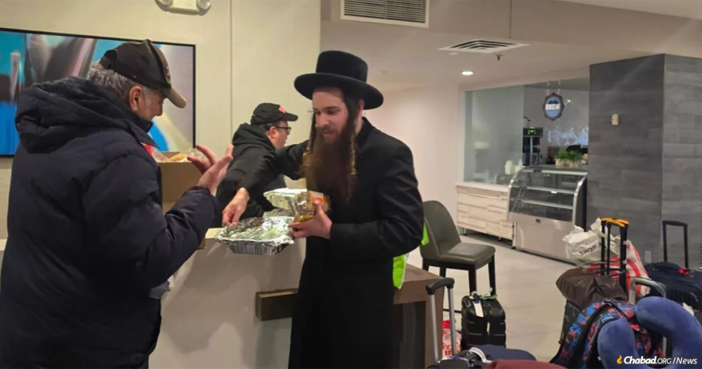 They emptied the community center’s freezer, preparing chicken, pasta and rice for all 300 travelers. At the same time, they coordinated with Kosher Spot, the local kosher supermarket, to arrange a special delivery of cold cuts, bread, bagels, instant soups, and packaged pastries to distribute.
