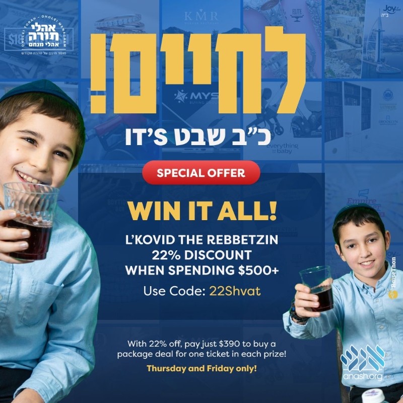 With a special code valid today and tomorrow only, the Chof Beis Shvat discount will offer you 22% off of all tickets when spending $500+ and a special rate of just $390 for the “1 ticket in each prize” package deal, including a ticket for the ultimate $18,000 cash prize.