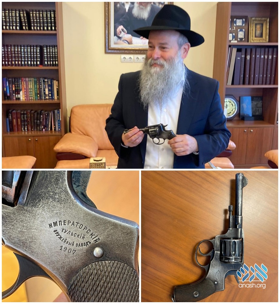 The gun had first been discovered in the early 1990s in the central shul of Dnepropetrovsk, where Harav Levi Yitzchok Schneerson had served as rov, and his son, the Rebbe, had davened as a child and bochur. It had been concealed in the shul by a group of Jewish vigilantes, who had organized to protect the Jewish community from roving mobs and the Red Army and White Army, who were fighting for control of Russia following the Russian revolution of 1917.