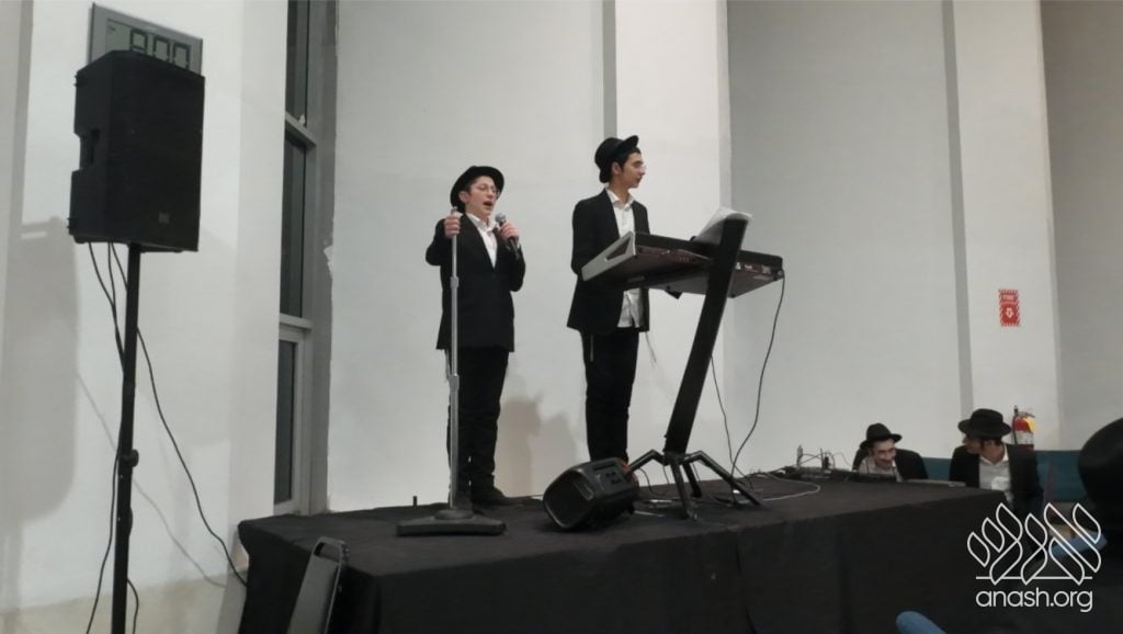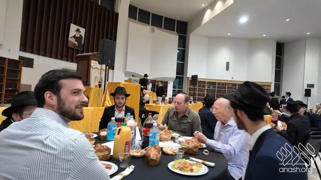 The event included a full-course seudah, which, although elegant and professional, quickly turned into a lively farbrengen. As the guests took their places, one of the yeshiva bochurim played slow niggunim, while another bochur took the microphone and sang, setting a warm and uplifting tone.
