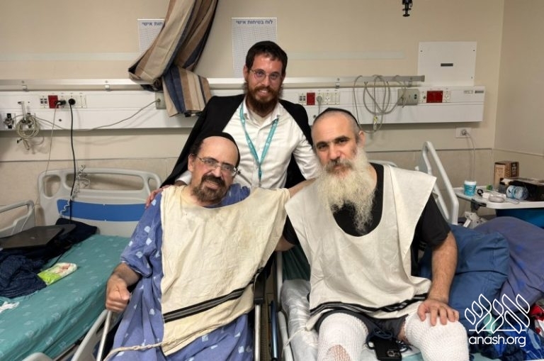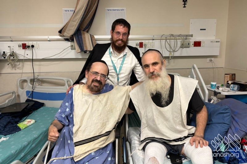 Rabbi Liraz Zeira, shliach to Yerushalayim campuses who lost both legs following a severe IDF injury in Syria, and Rabbi Mendy Lichtstein of Chabad Zhytomyr, Ukraine, who recently underwent a leg amputation, joined Rabbi Mendy Beckerman, the Rebbe’s shliach at the hospital, in a spirited chassidishe dance.