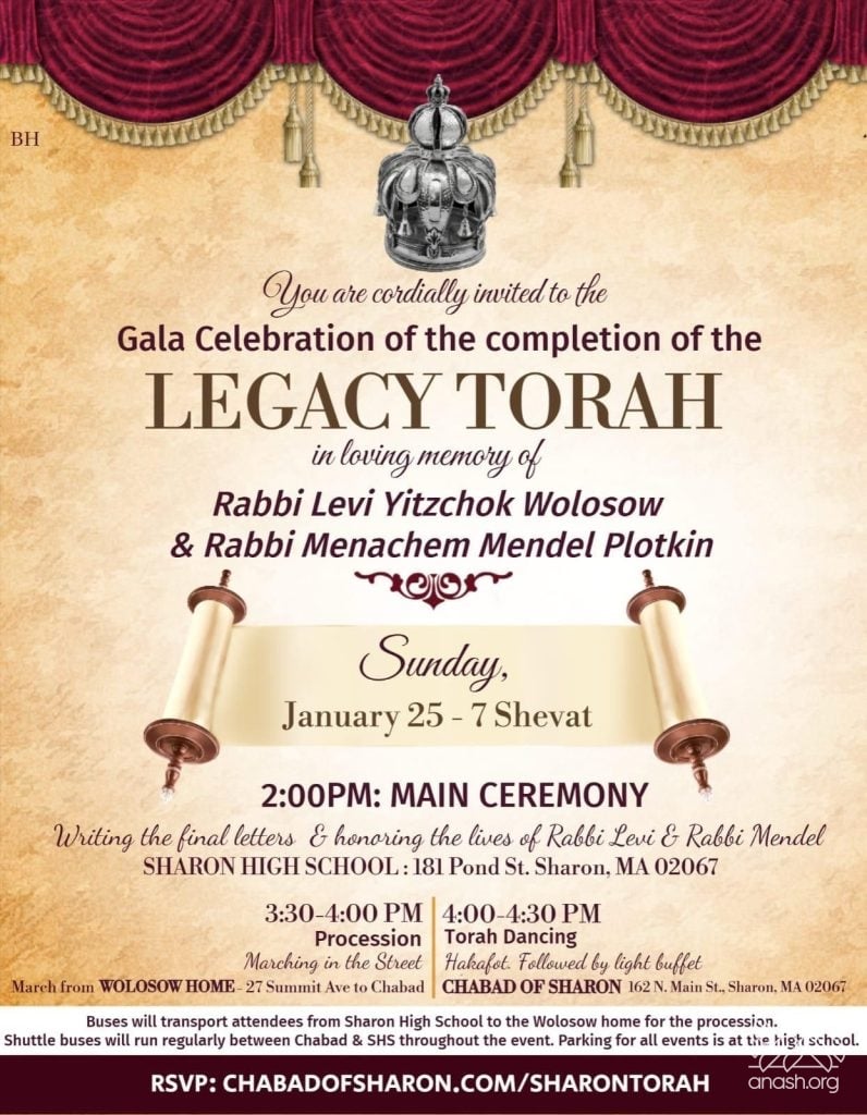 A siyum sefer Torah will take place in Sharon, MA, on Sunday, 7 Shvat, by the Wolosow family, l’iluy nishmas Rabbi Levi Yitzchok Wolosow a”h and Rabbi Menachem Mendel Plotkin a”h.