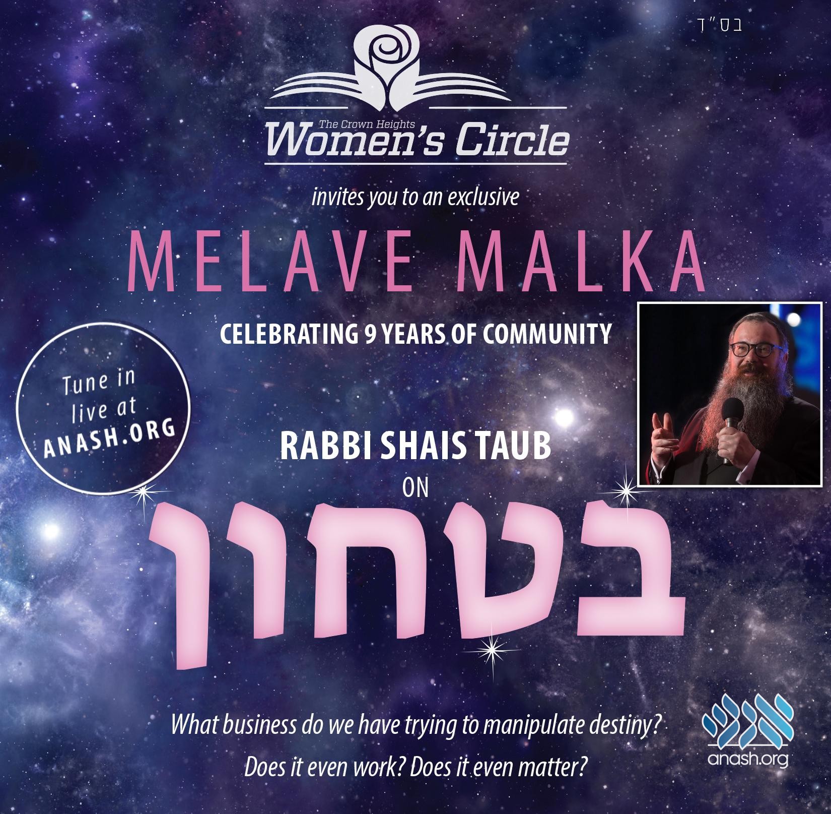 The Women’s Circle of Crown Heights’s tenth annual melave malka will be taking place Motzei Shabbos with a live stream on Anash.org, and featuring an address on Bitachon by Rabbi Shais Taub.