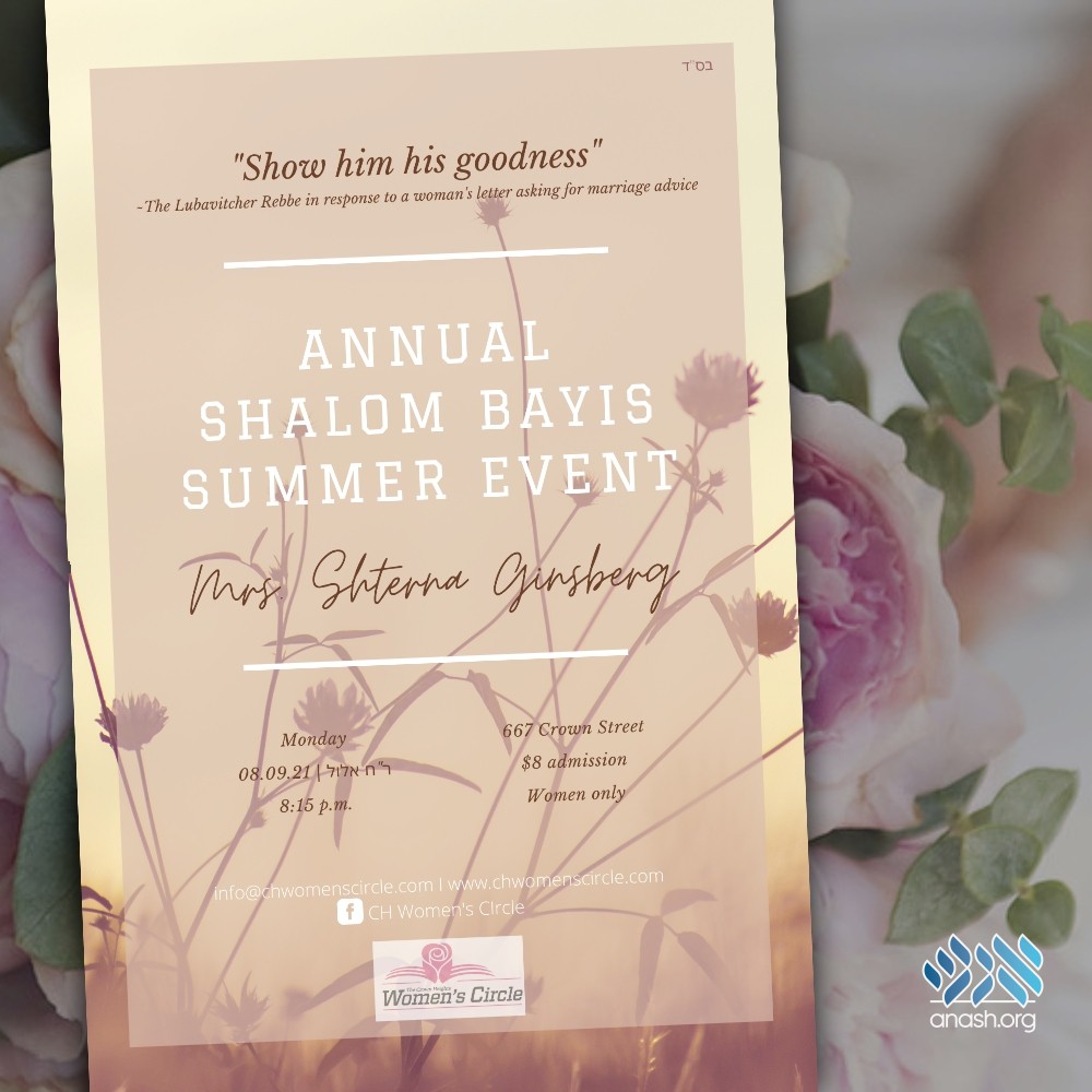 The Crown Heights Women’s Circle is hosting their annual shalom bayis summer event this Monday evening, with guest speaker Mrs. Shterna Ginsberg.