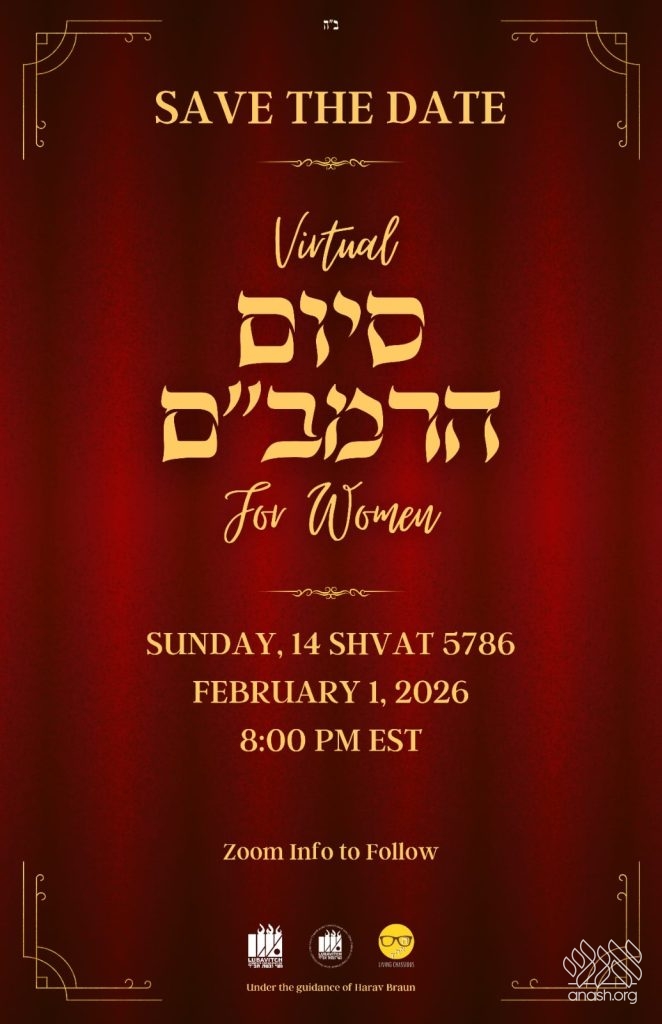 The women’s Siyum Harambam will take place Sunday evening, 14 Shevat, Feb 1, at 8:00 PM over Zoom. Full details, including Zoom access information, will be provided soon.