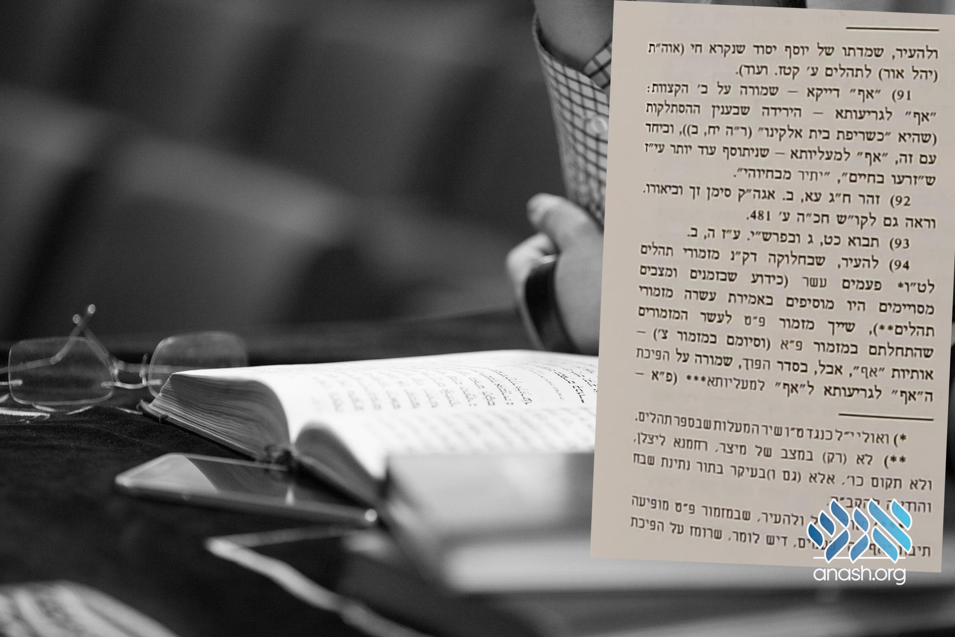Footnote 94: To point out that in the division of Tehillim of 150 kapitals into 15 x 10, (as is known that in certain times and situations people would say an additional 10 kapitals of Tehillim**), Kapital פ”ט is connected to the 10 kapitals that start with kapital פ”א (and conclude with kapital צ)- the letters “af”, but, when the order is reversed, which shows on transforming the negative “af” to the positive “אף” (pei aleph- Roshei Teivos פלאות אראנו (I will show you wonders)****, that the main emphasis is on the revelation to eyes of flesh — “אראנו” — on good that is apparent and revealed.