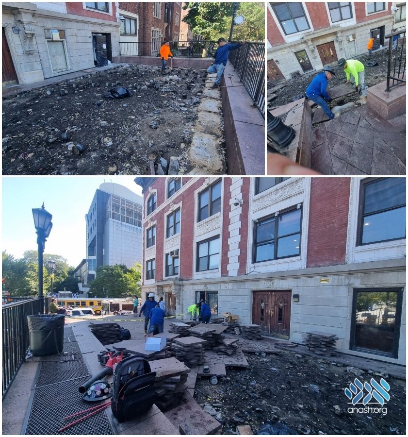 The terrace in front of 770’s Eastern Parkway Women’s Section is being ripped out and replaced ahead of the yomim tovim. The repair will correct the broken tiles and will waterproof the shul below it.
