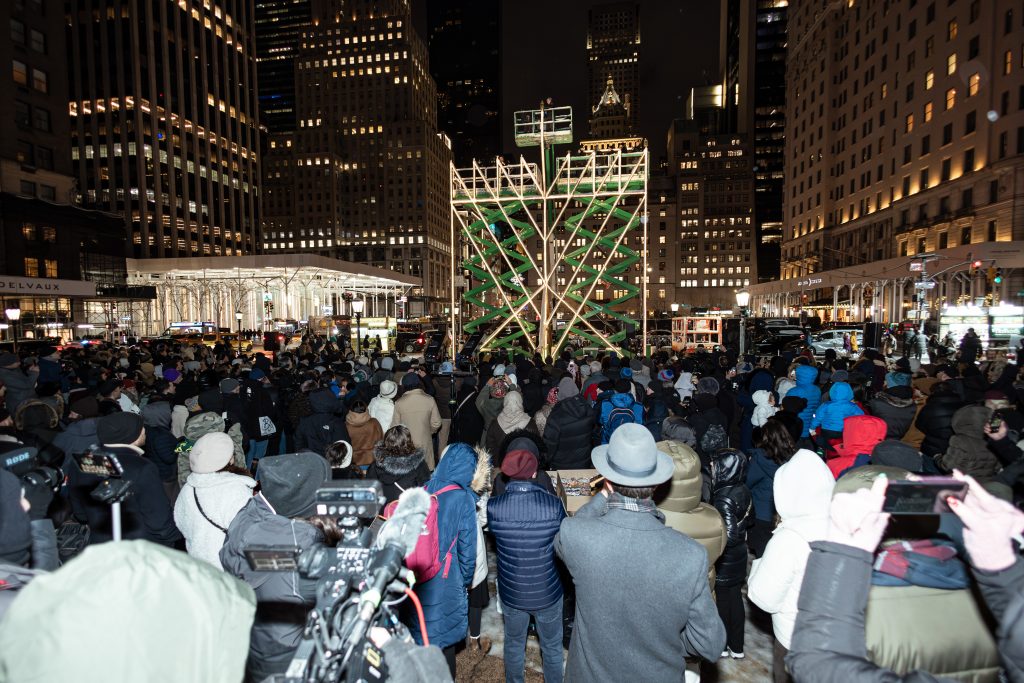 Nightly festivities featured spirited musical performances from Chassidic singing sensation Yoni Zigelboum, world-renowned musician Andy Statman, and Brooklyn’s own Rabbi Eli Raskin. Yeshiva students distributed dozens of menorahs and jelly donuts each evening, spreading the holiday joy beyond the plaza.