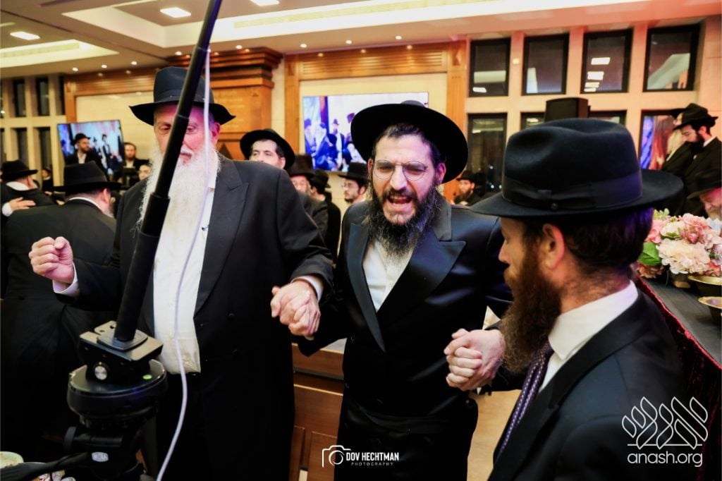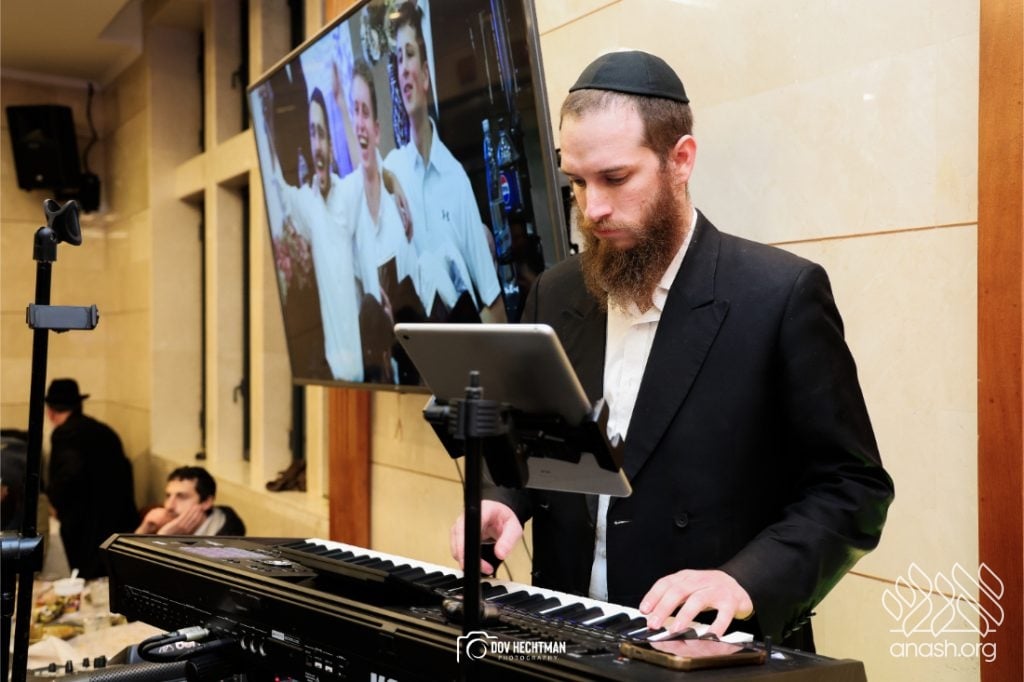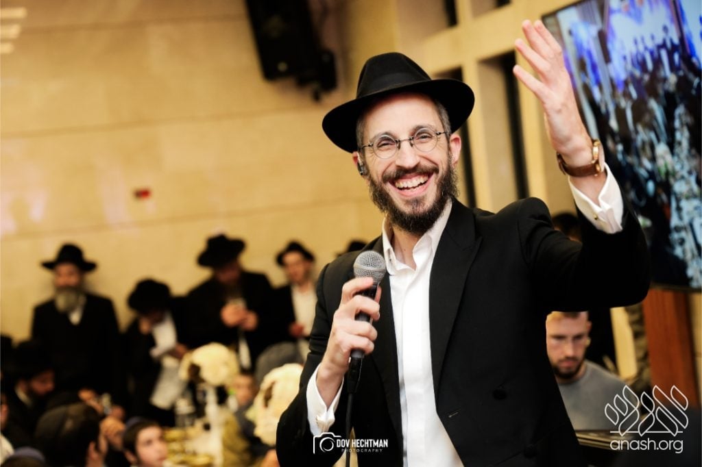 The chassidishe singer R’ Simche Friedman provided beautiful musical accompaniment throughout the evening, together with keyboardist R’ Avremi Cohen, filling the hall with niggunim and leading hours of joyful singing and dancing.