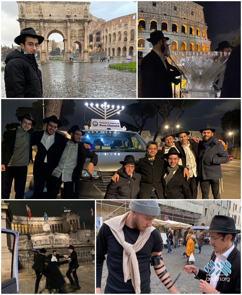 A group of bochurim from Brunoy Yeshiva organized a widespread Chanukah mivtzoim campaign in Rome, Italy this past Chanukah, with a Mitzvah Tank, menorah lightings near famous landmarks, and distributing over 350 menorah kits.