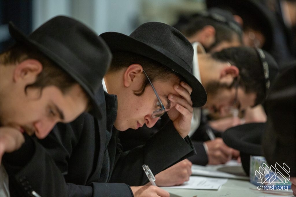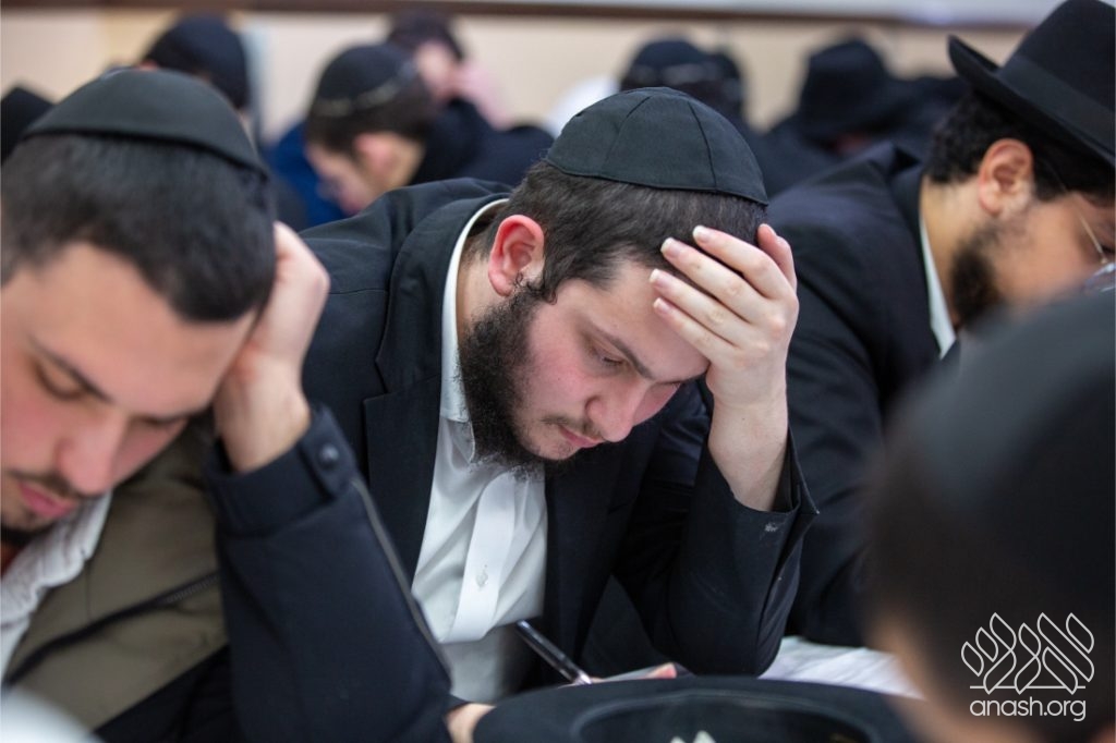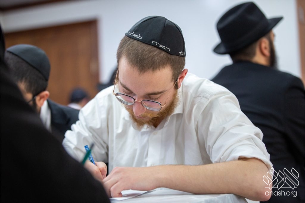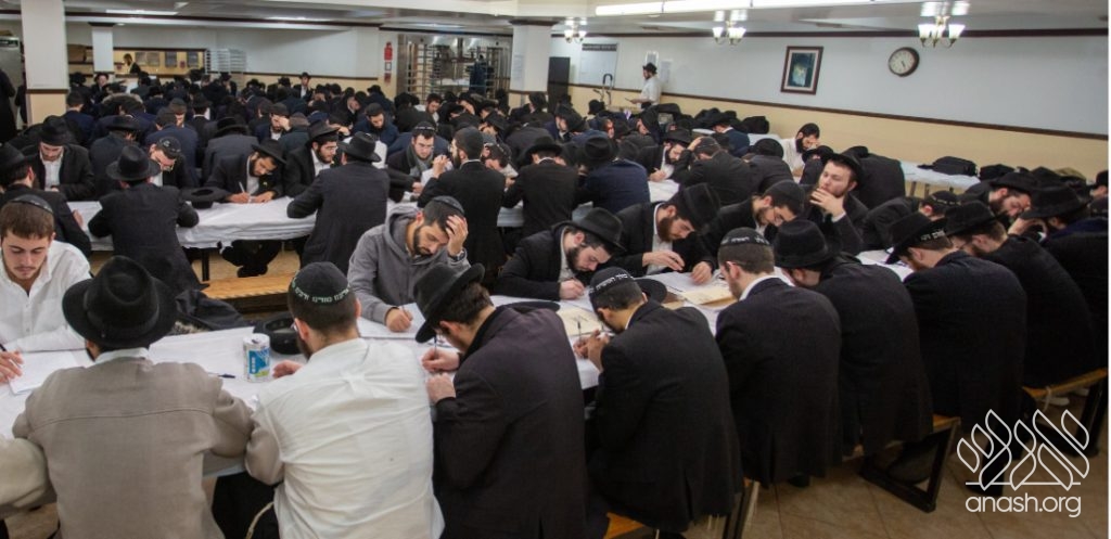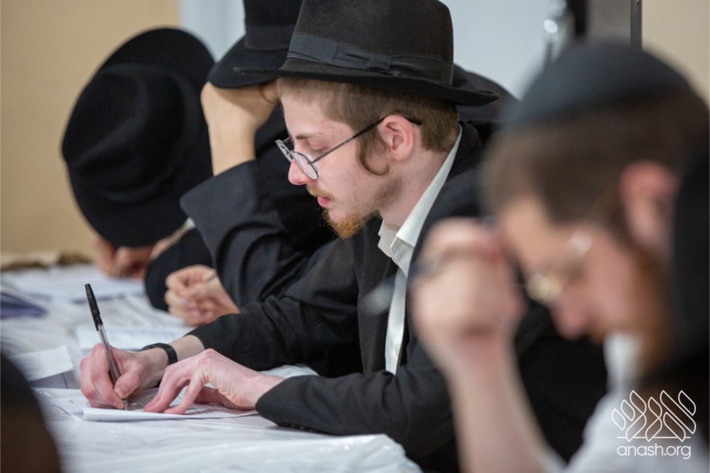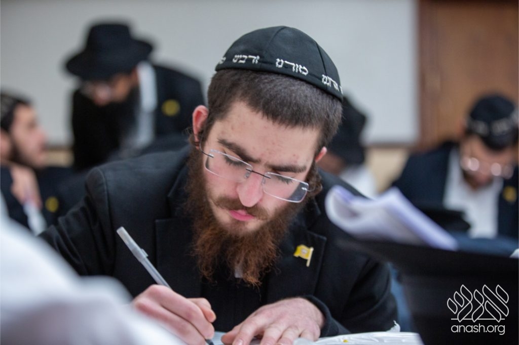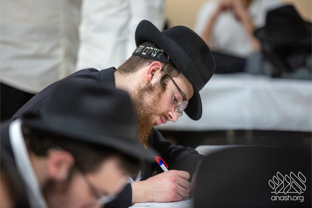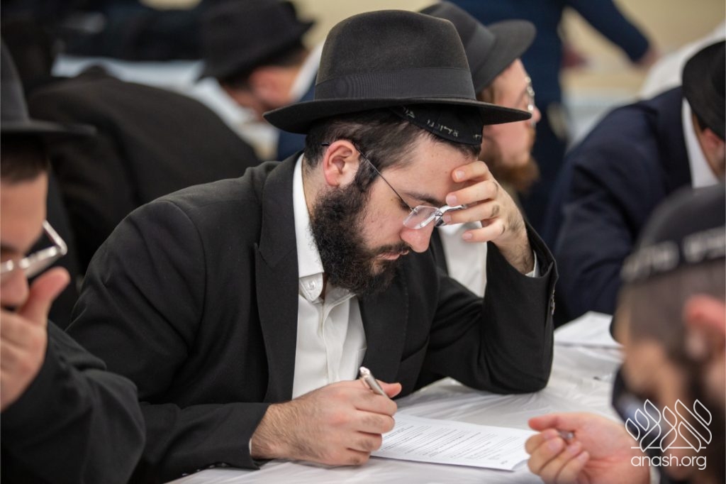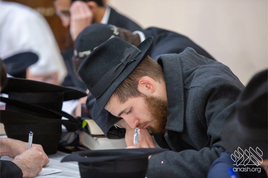 The monthly test, held on Thursday, revealed the impressive scope of participation. The dining room, which in previous years sufficed for all the bochurim, was filled to capacity. As a result, an additional testing location was opened at the Eshel Hotel, where all participants in the halacha track gathered. In both locations combined, a crowd was recorded unlike anything seen before, with long rows of temimim laboring over the test papers, investing effort and being precise in every detail.