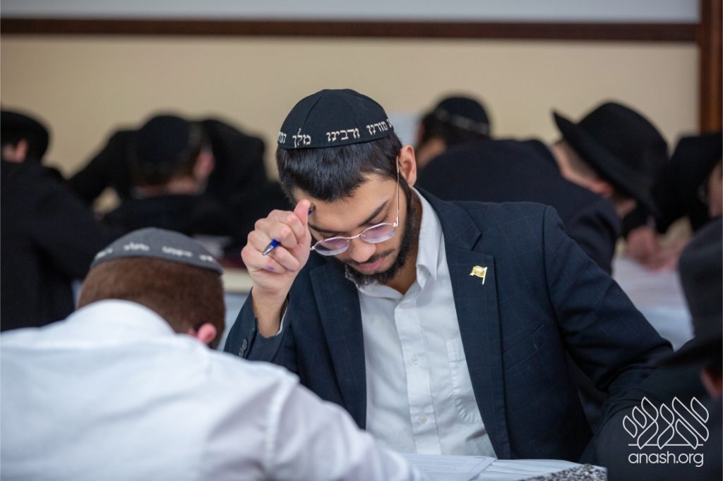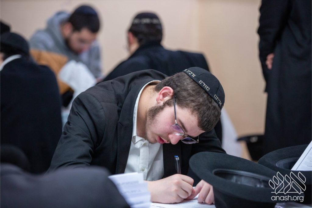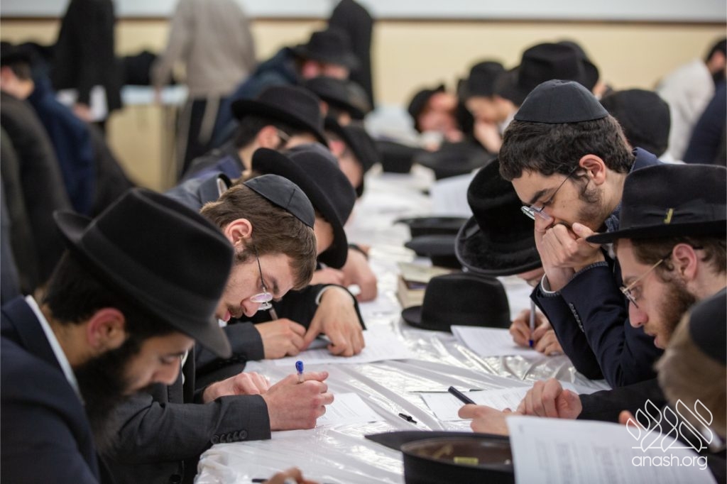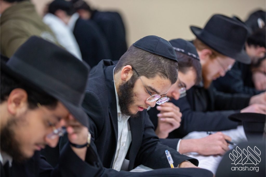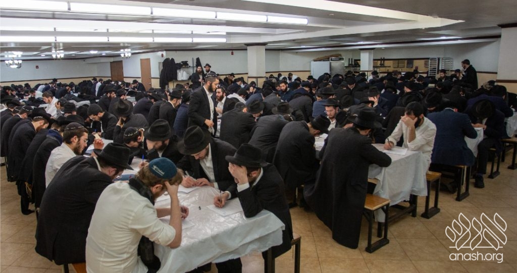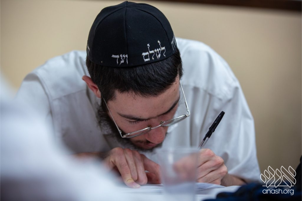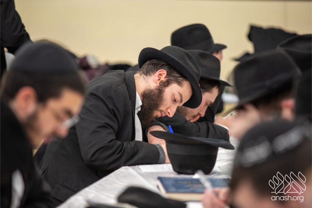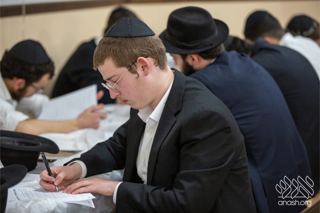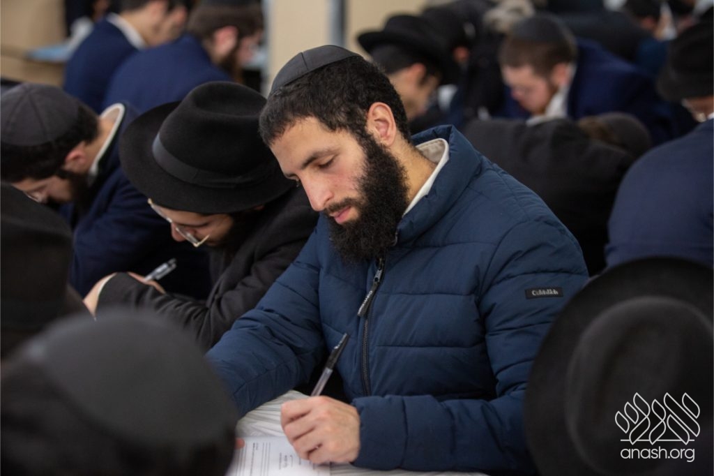 The monthly test, held on Thursday, revealed the impressive scope of participation. The dining room, which in previous years sufficed for all the bochurim, was filled to capacity. As a result, an additional testing location was opened at the Eshel Hotel, where all participants in the halacha track gathered. In both locations combined, a crowd was recorded unlike anything seen before, with long rows of temimim laboring over the test papers, investing effort and being precise in every detail.
