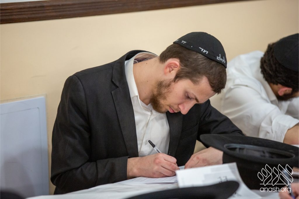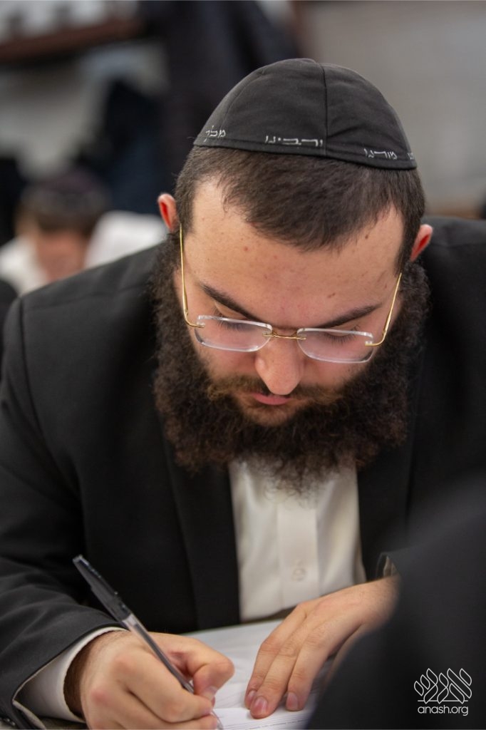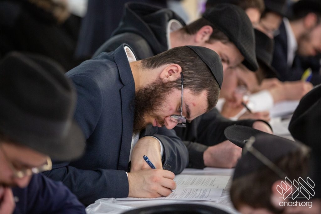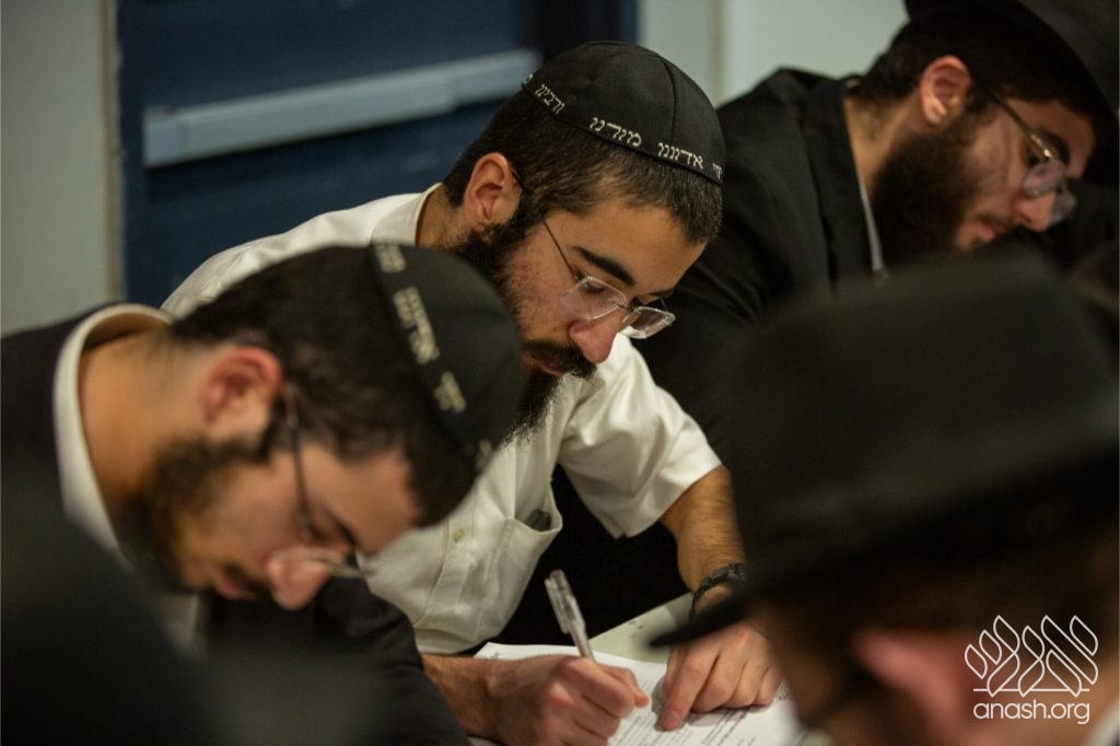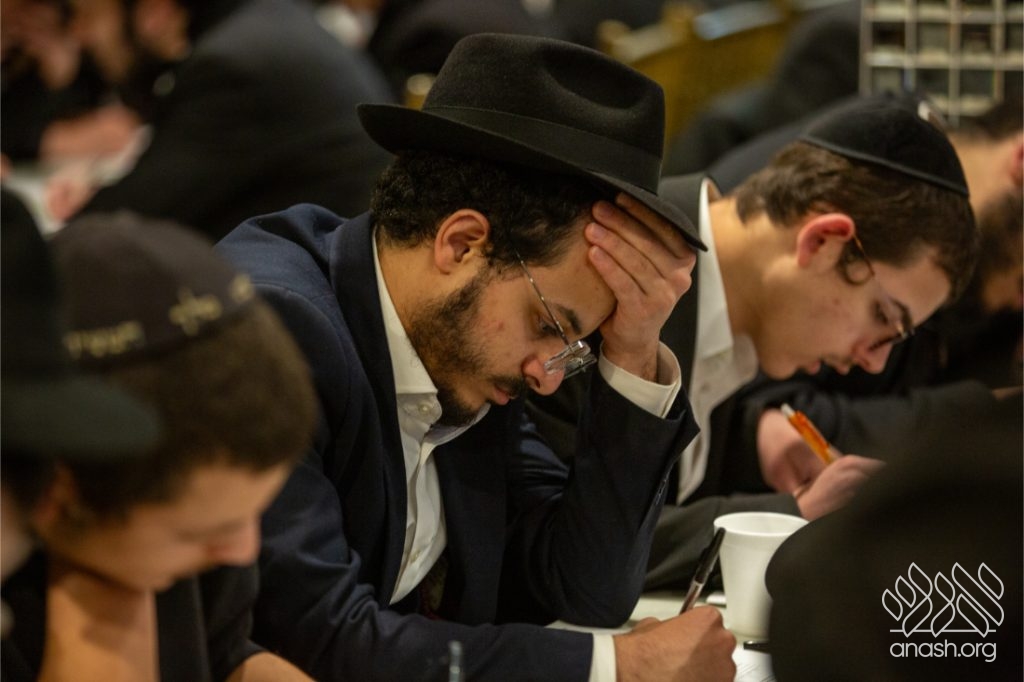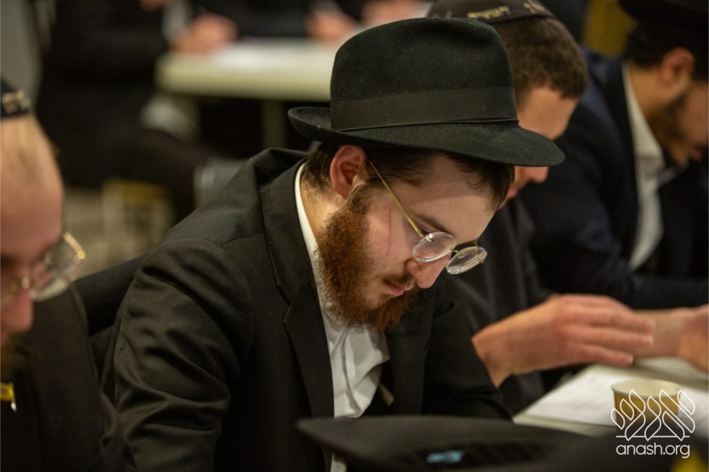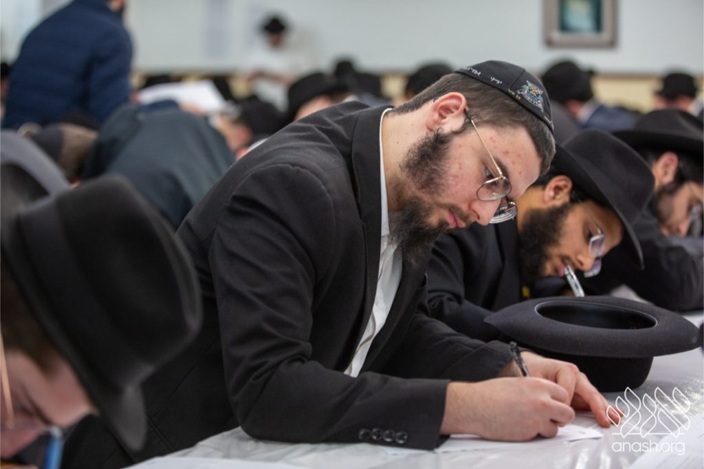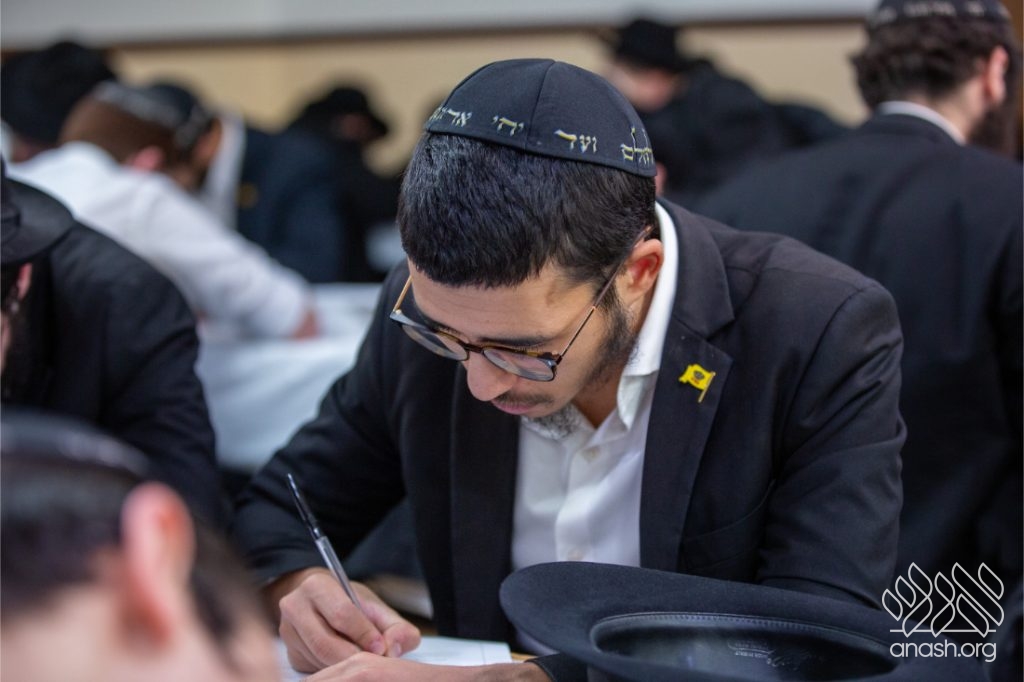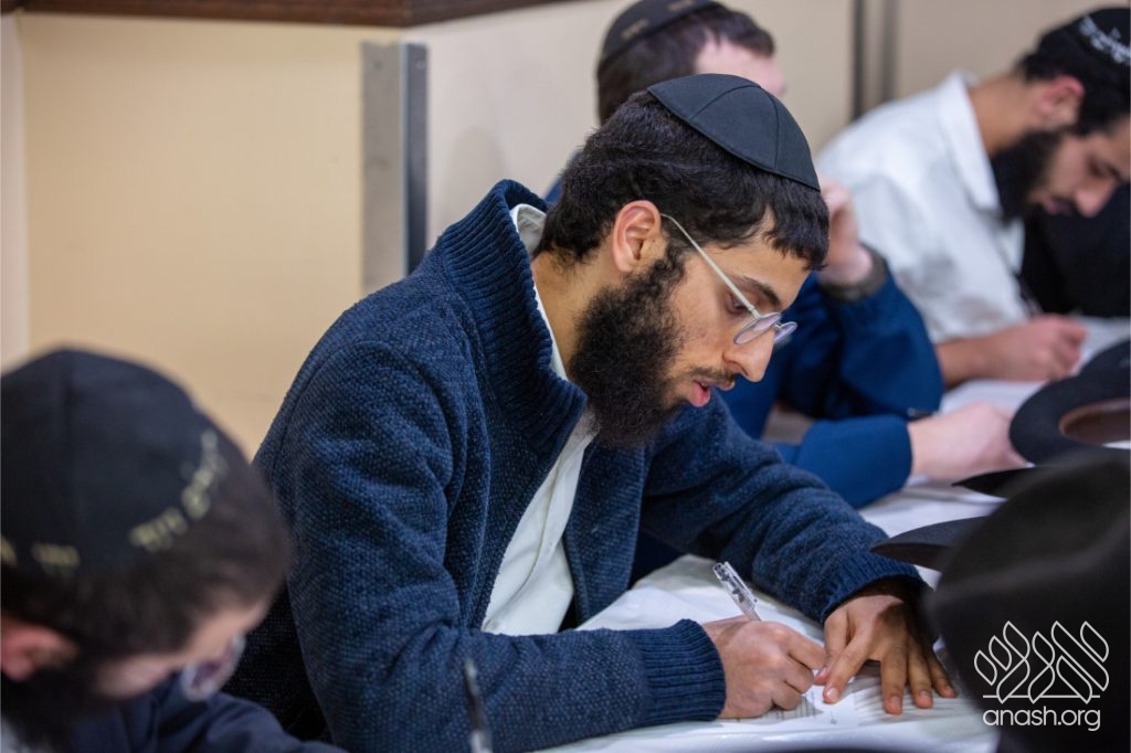 The monthly test, held on Thursday, revealed the impressive scope of participation. The dining room, which in previous years sufficed for all the bochurim, was filled to capacity. As a result, an additional testing location was opened at the Eshel Hotel, where all participants in the halacha track gathered. In both locations combined, a crowd was recorded unlike anything seen before, with long rows of temimim laboring over the test papers, investing effort and being precise in every detail.