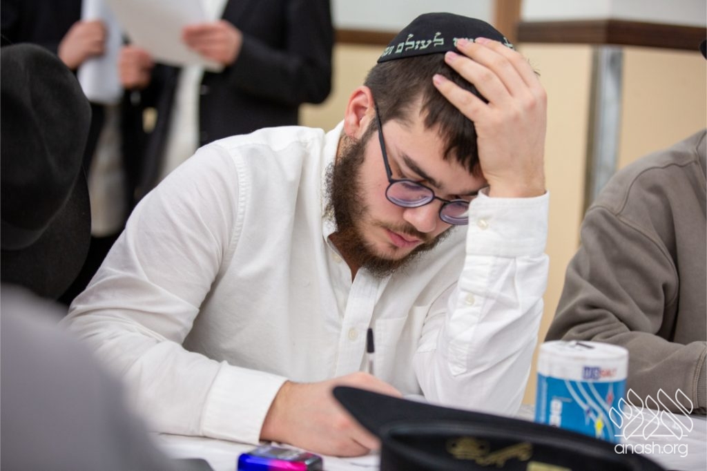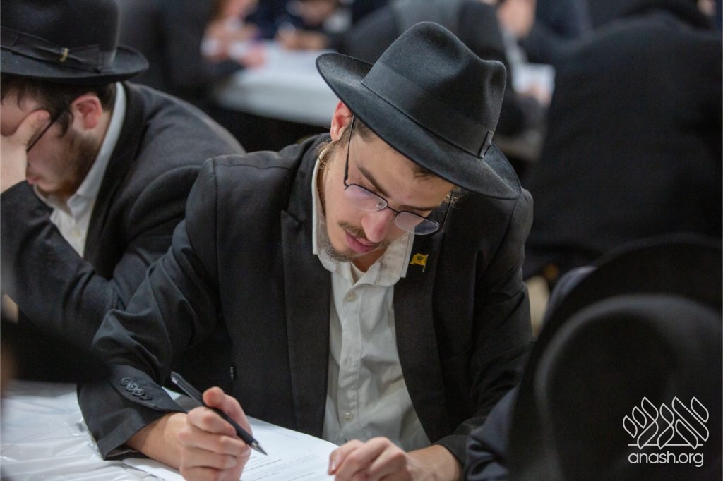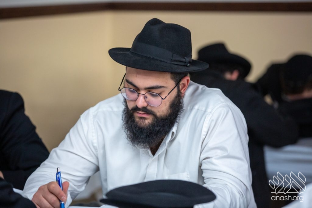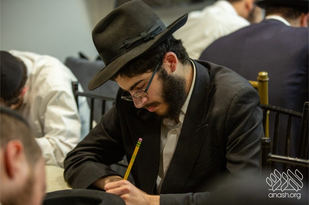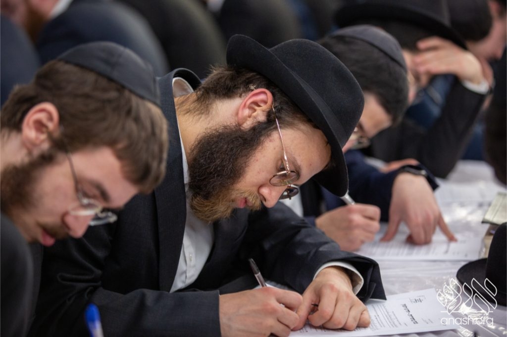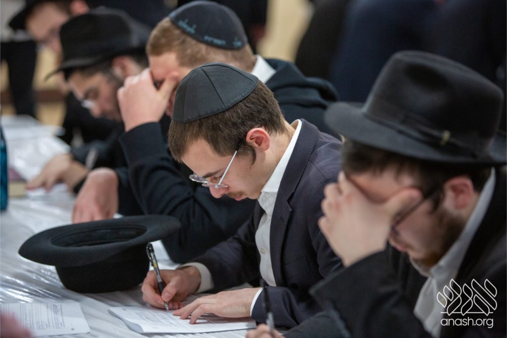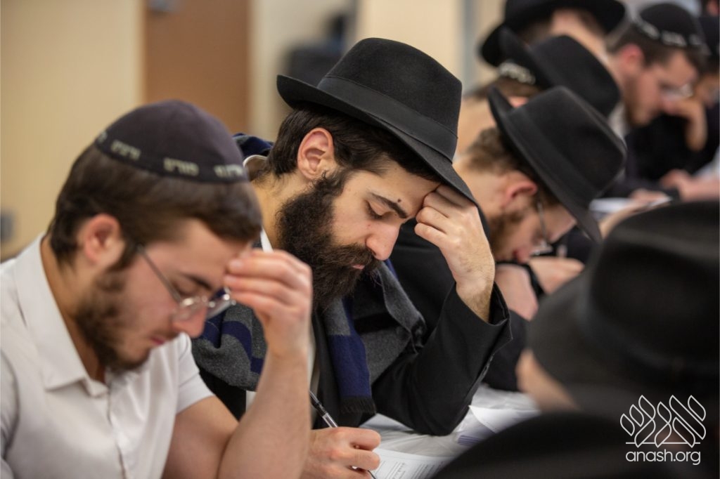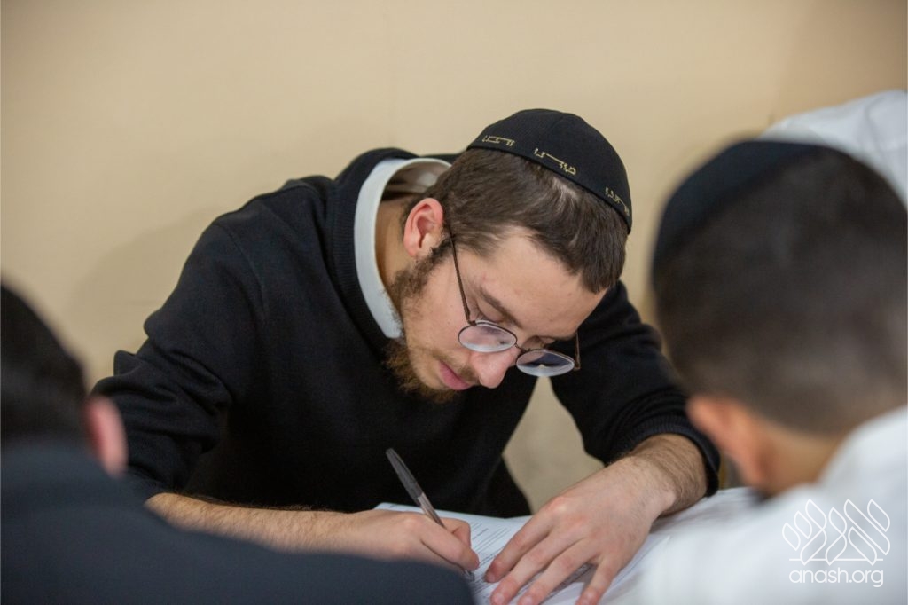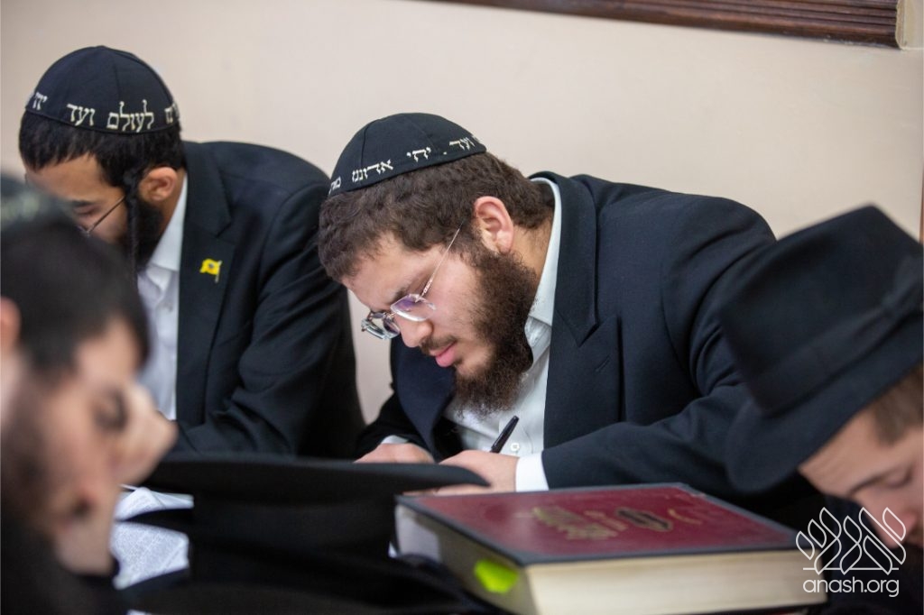 The monthly test, held on Thursday, revealed the impressive scope of participation. The dining room, which in previous years sufficed for all the bochurim, was filled to capacity. As a result, an additional testing location was opened at the Eshel Hotel, where all participants in the halacha track gathered. In both locations combined, a crowd was recorded unlike anything seen before, with long rows of temimim laboring over the test papers, investing effort and being precise in every detail.