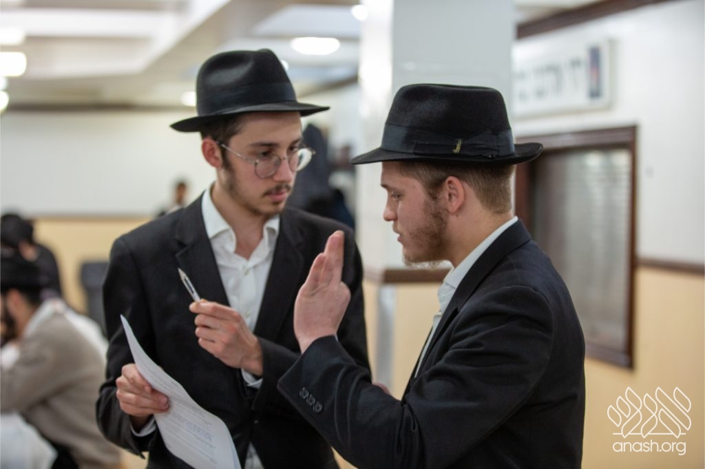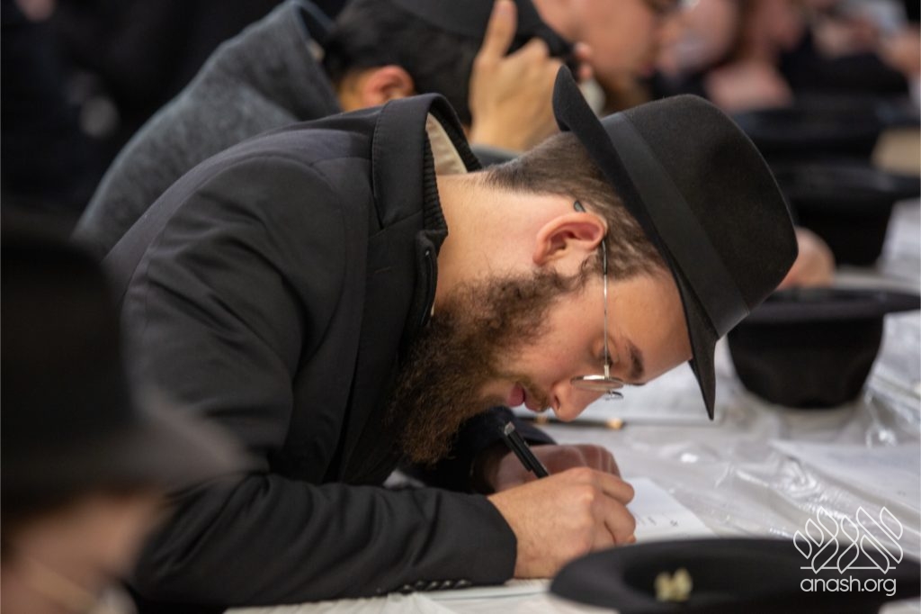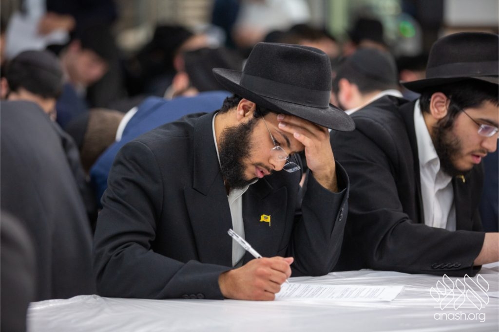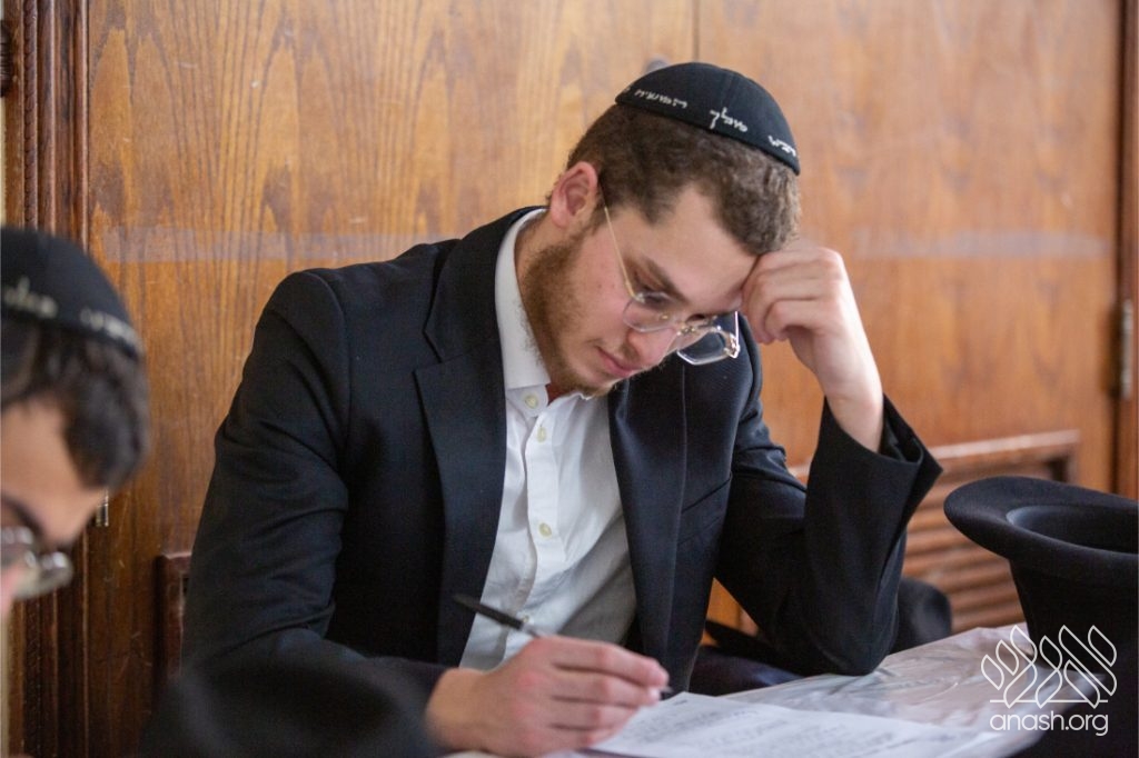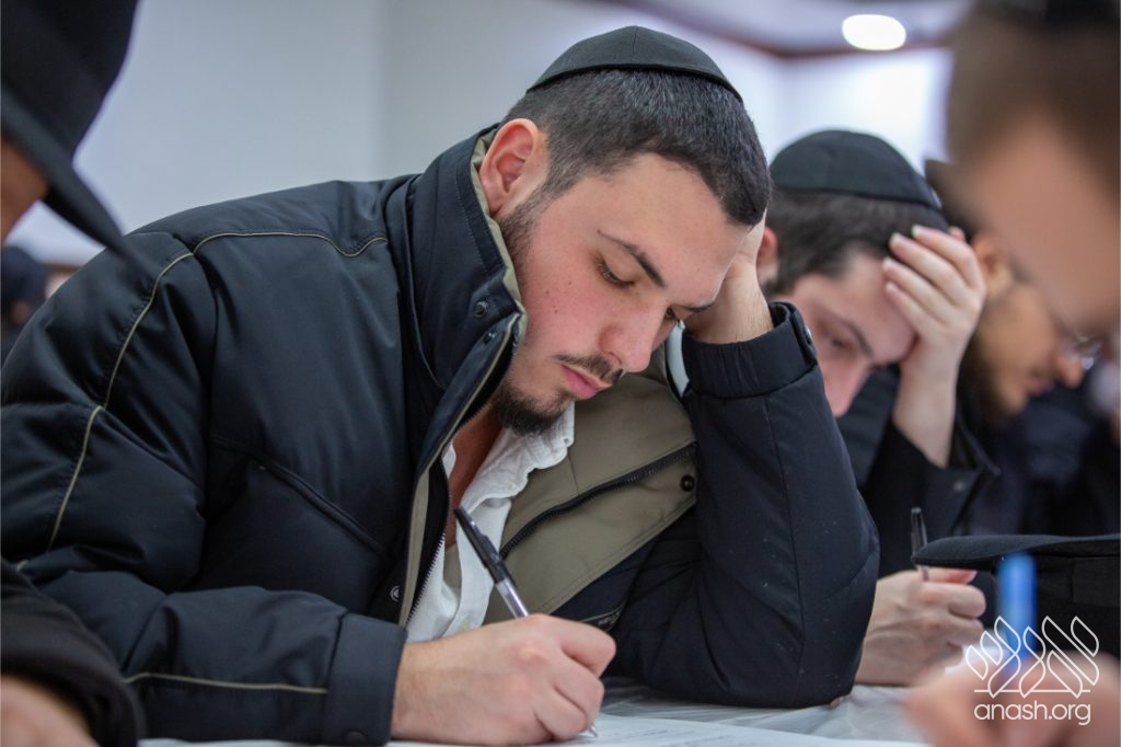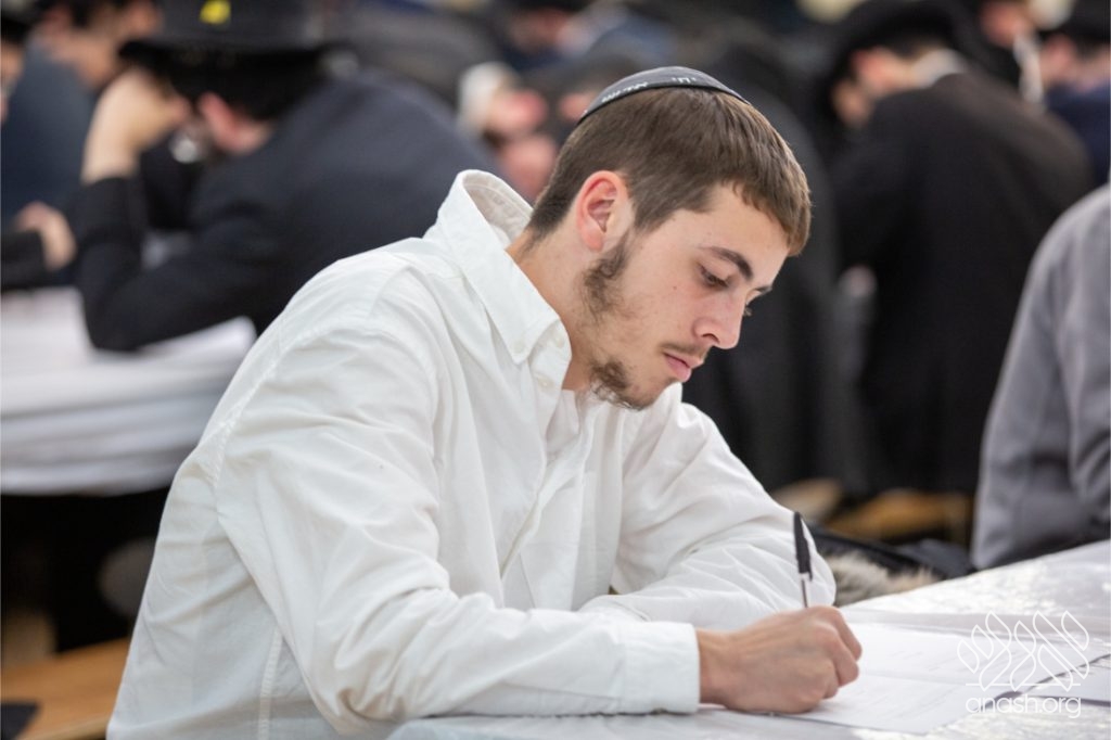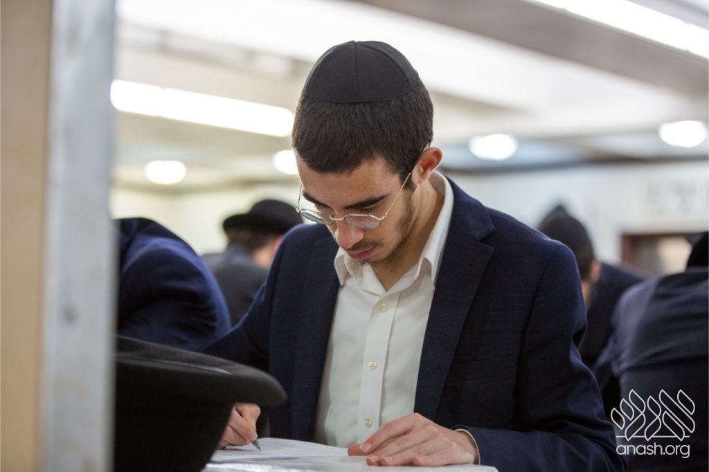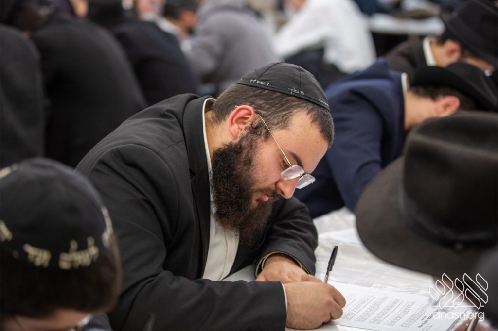 The monthly test, held on Thursday, revealed the impressive scope of participation. The dining room, which in previous years sufficed for all the bochurim, was filled to capacity. As a result, an additional testing location was opened at the Eshel Hotel, where all participants in the halacha track gathered. In both locations combined, a crowd was recorded unlike anything seen before, with long rows of temimim laboring over the test papers, investing effort and being precise in every detail.