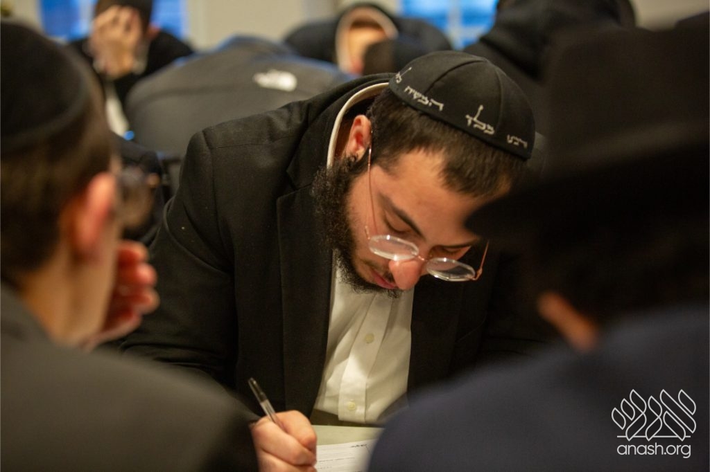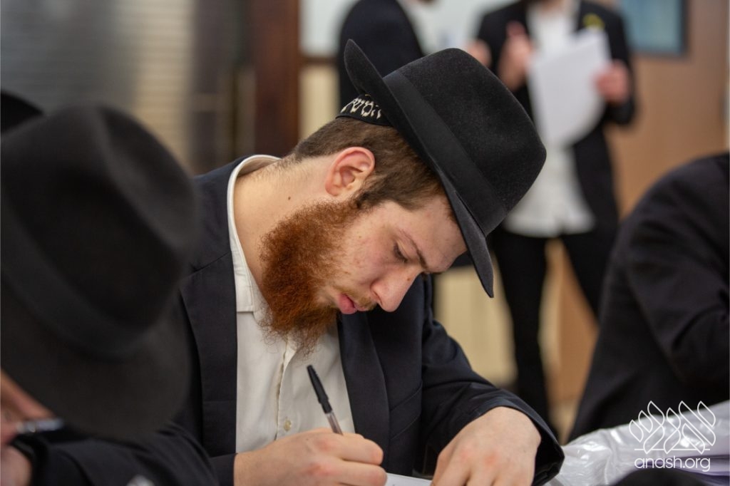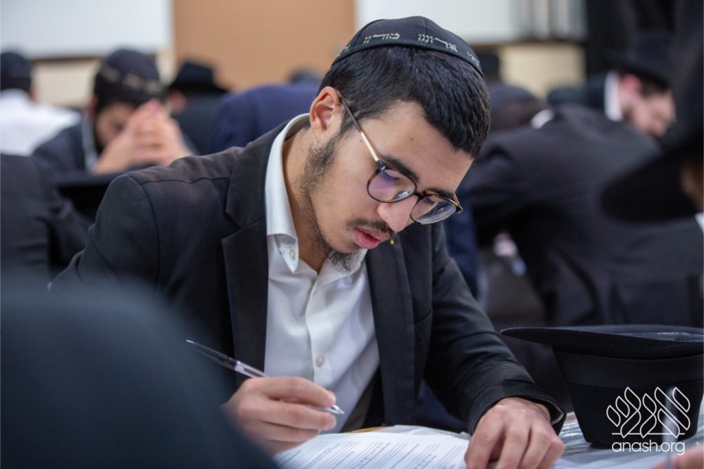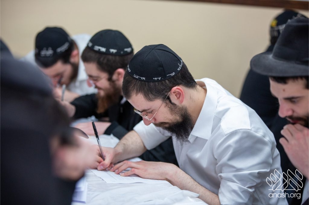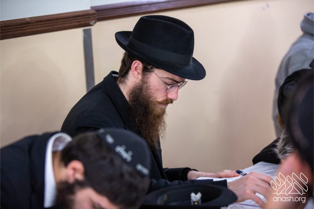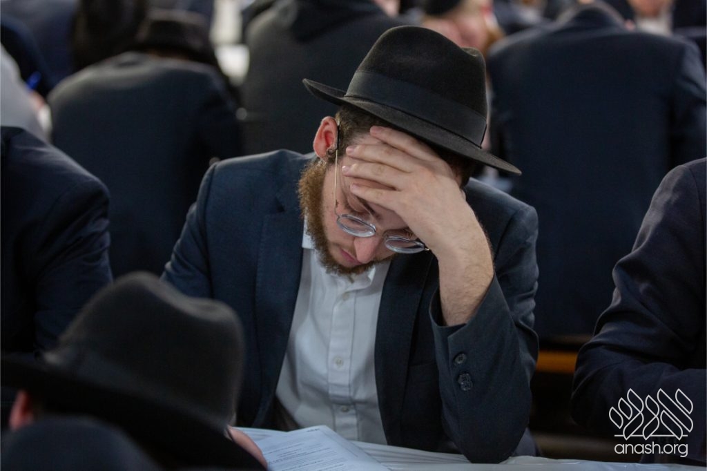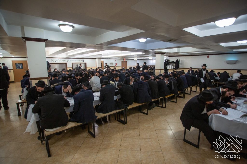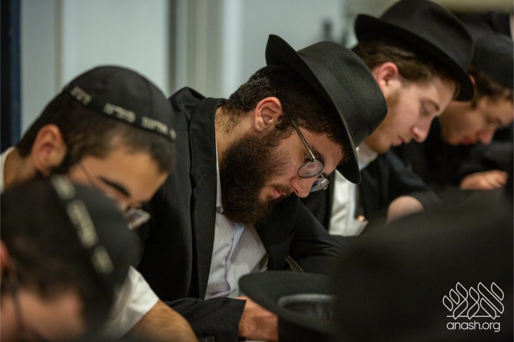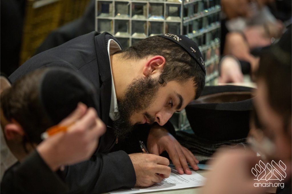 The monthly test, held on Thursday, revealed the impressive scope of participation. The dining room, which in previous years sufficed for all the bochurim, was filled to capacity. As a result, an additional testing location was opened at the Eshel Hotel, where all participants in the halacha track gathered. In both locations combined, a crowd was recorded unlike anything seen before, with long rows of temimim laboring over the test papers, investing effort and being precise in every detail.
