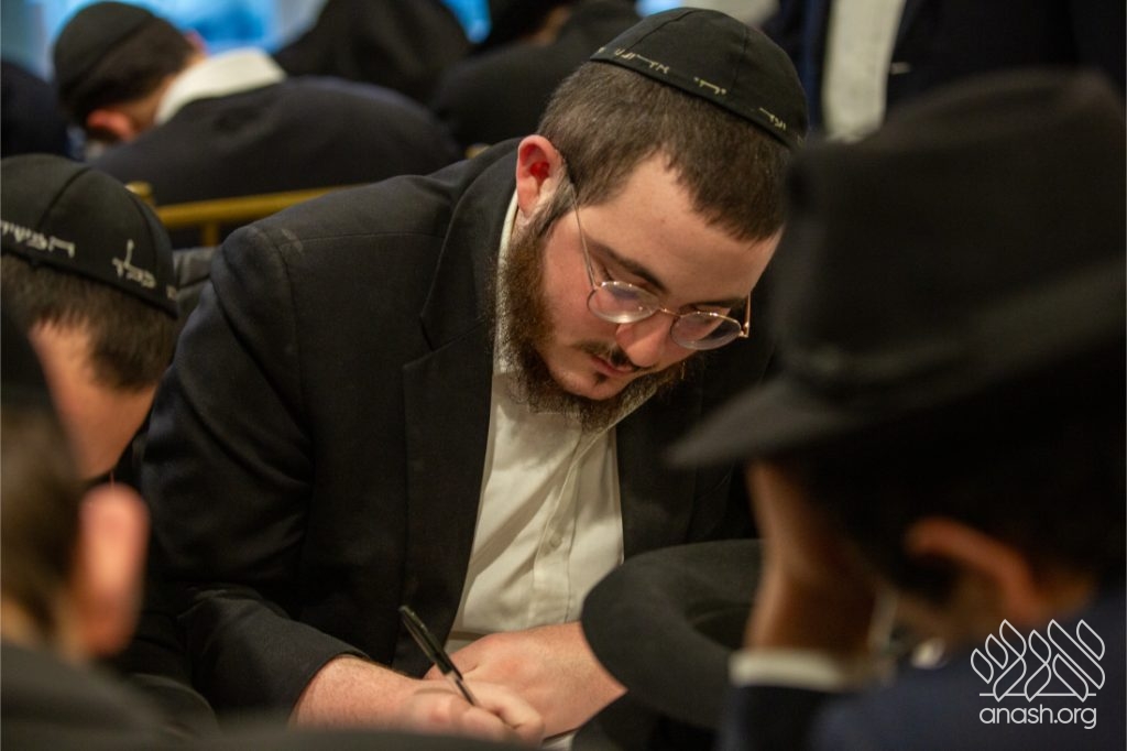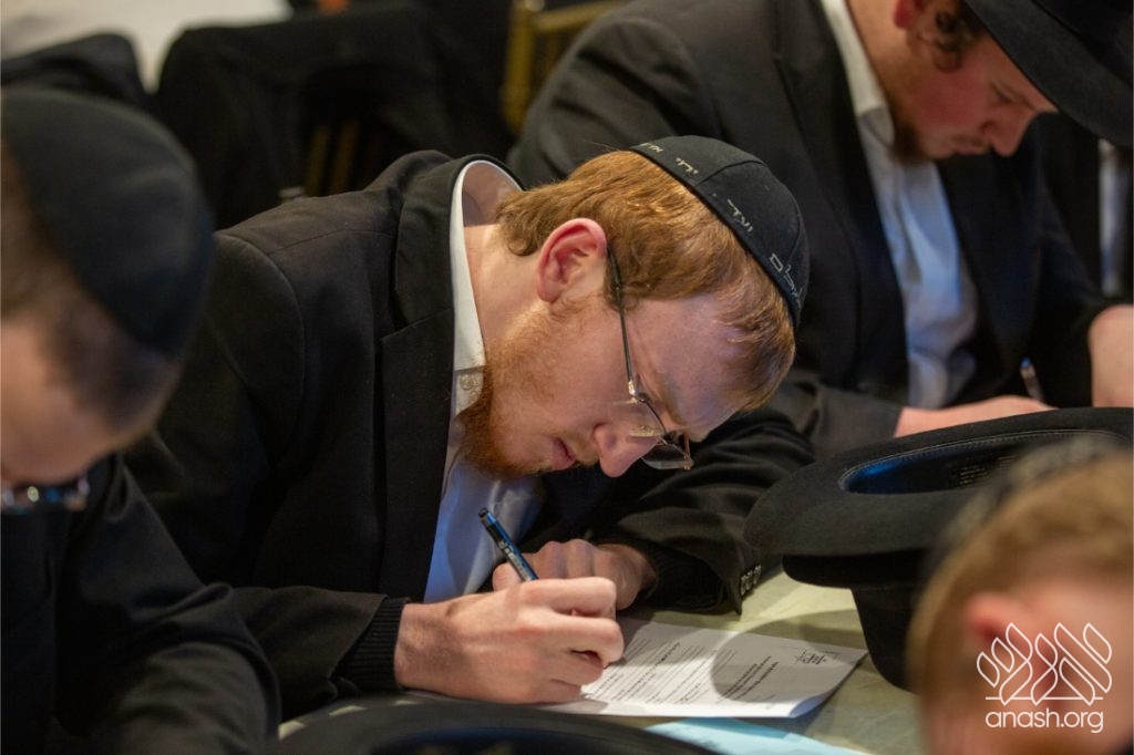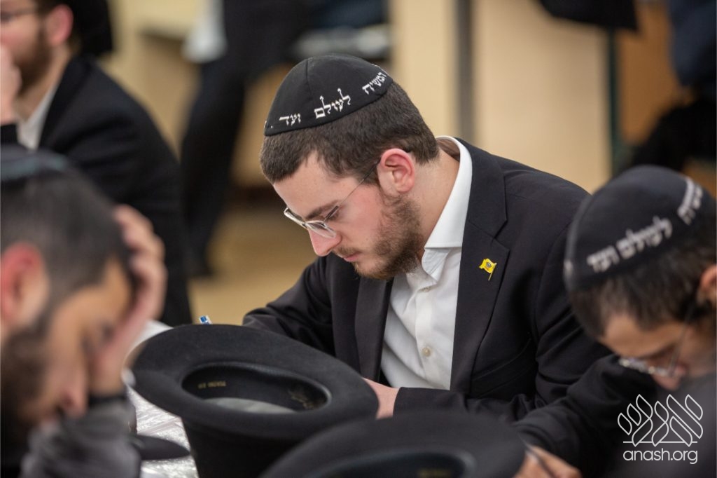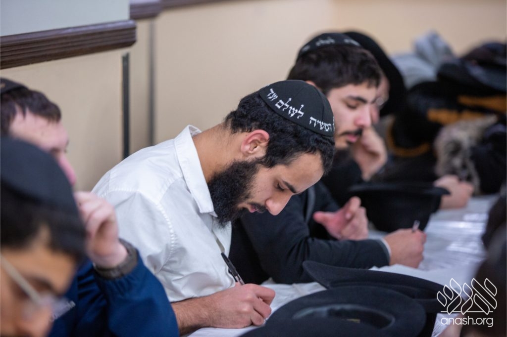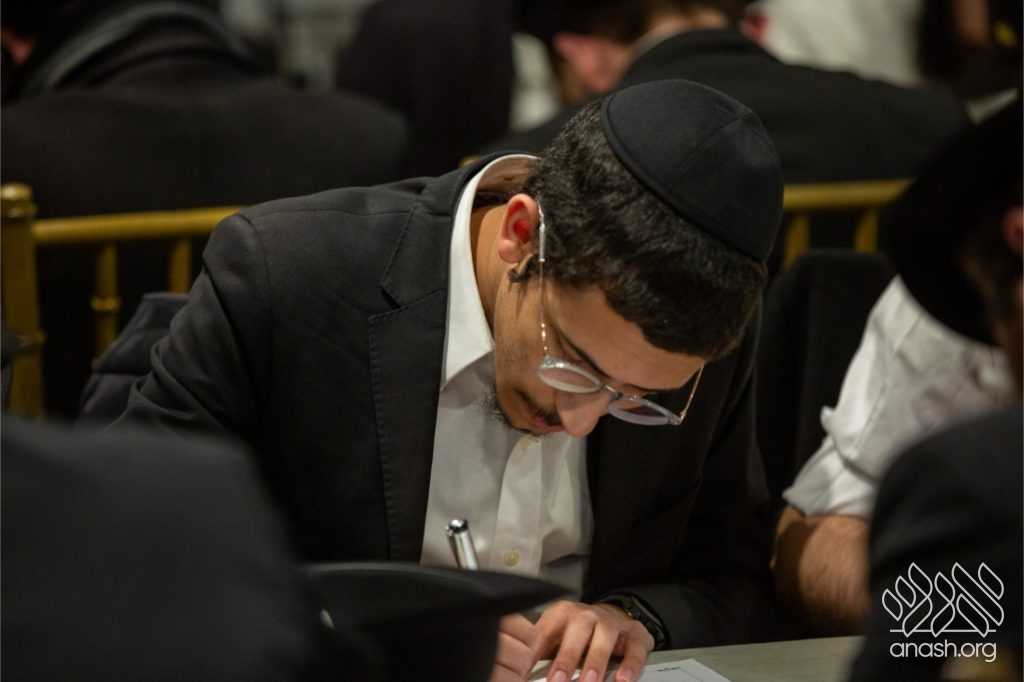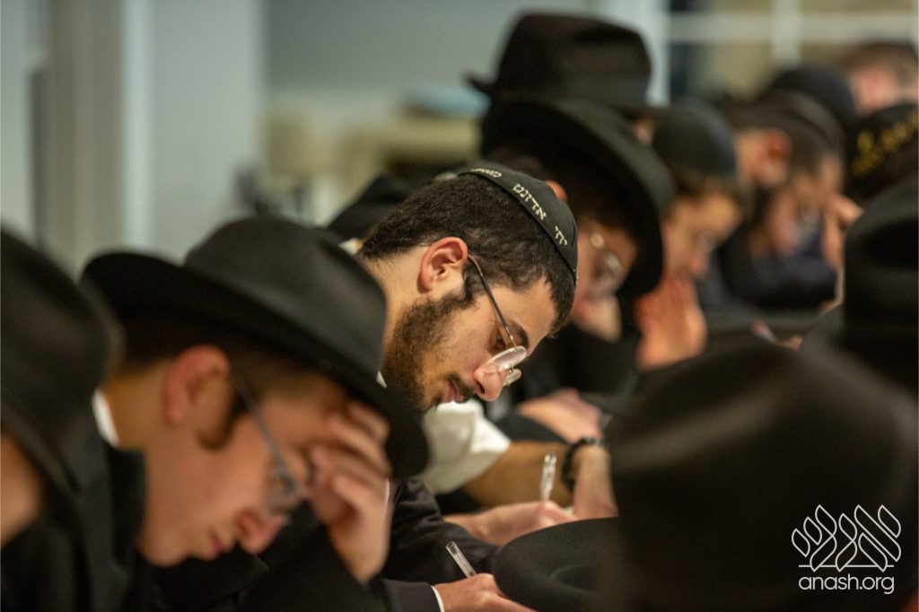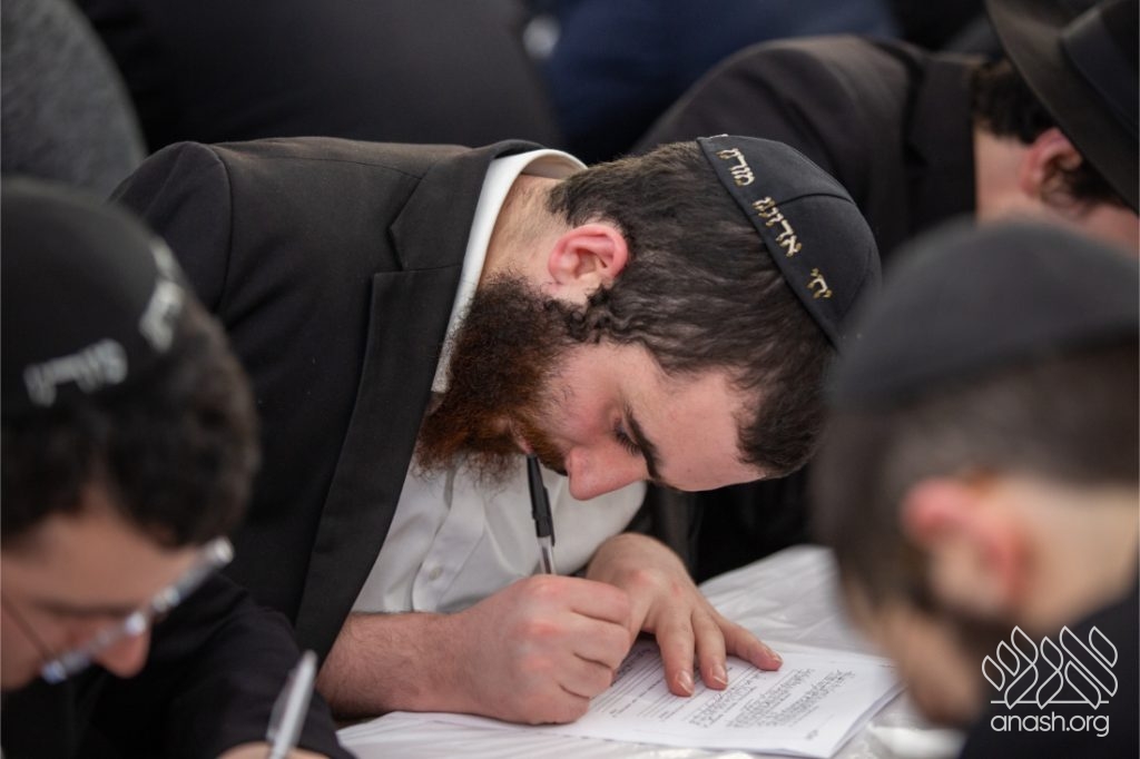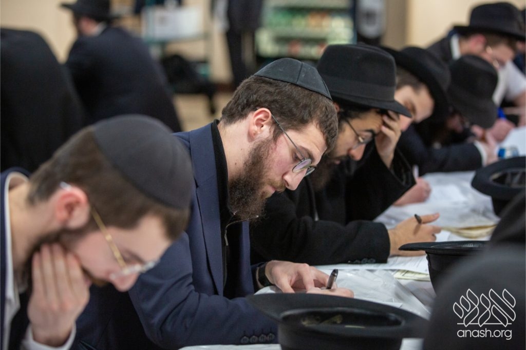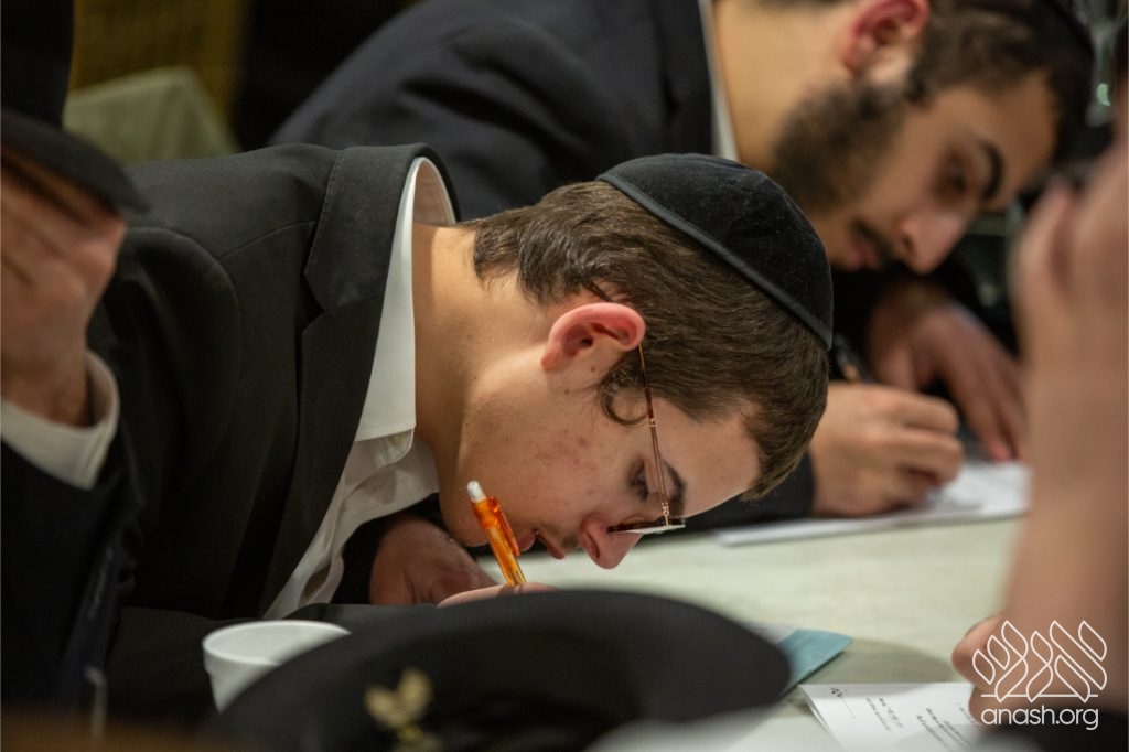 The monthly test, held on Thursday, revealed the impressive scope of participation. The dining room, which in previous years sufficed for all the bochurim, was filled to capacity. As a result, an additional testing location was opened at the Eshel Hotel, where all participants in the halacha track gathered. In both locations combined, a crowd was recorded unlike anything seen before, with long rows of temimim laboring over the test papers, investing effort and being precise in every detail.