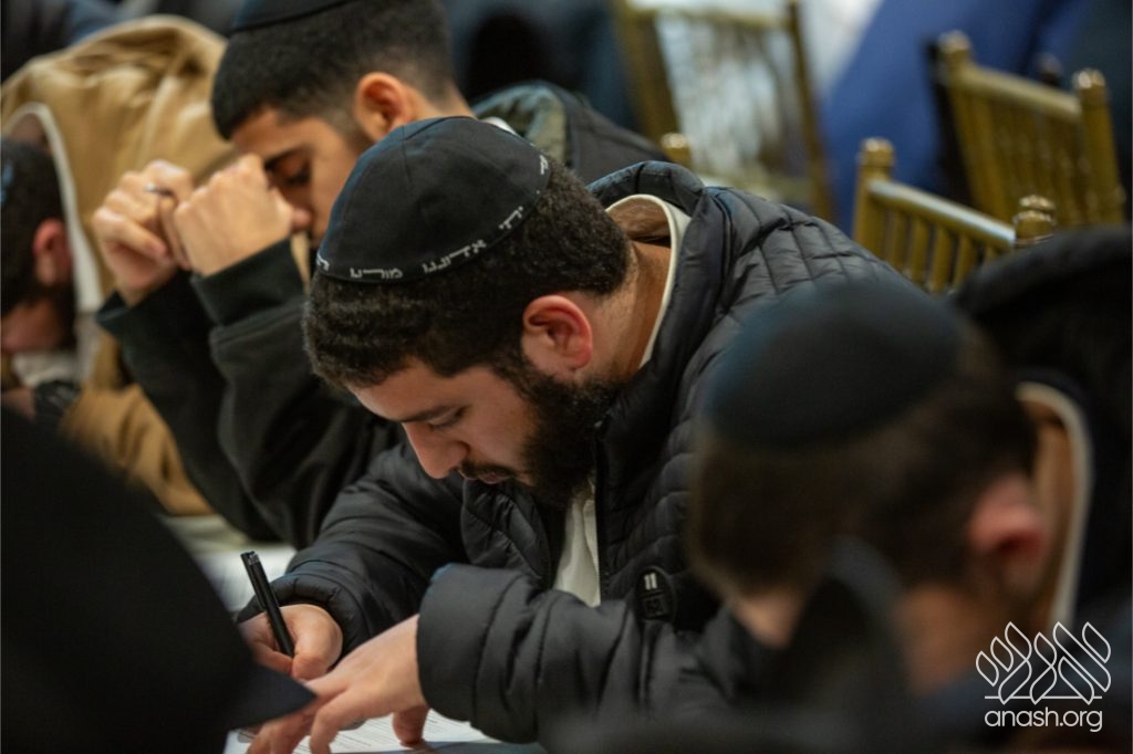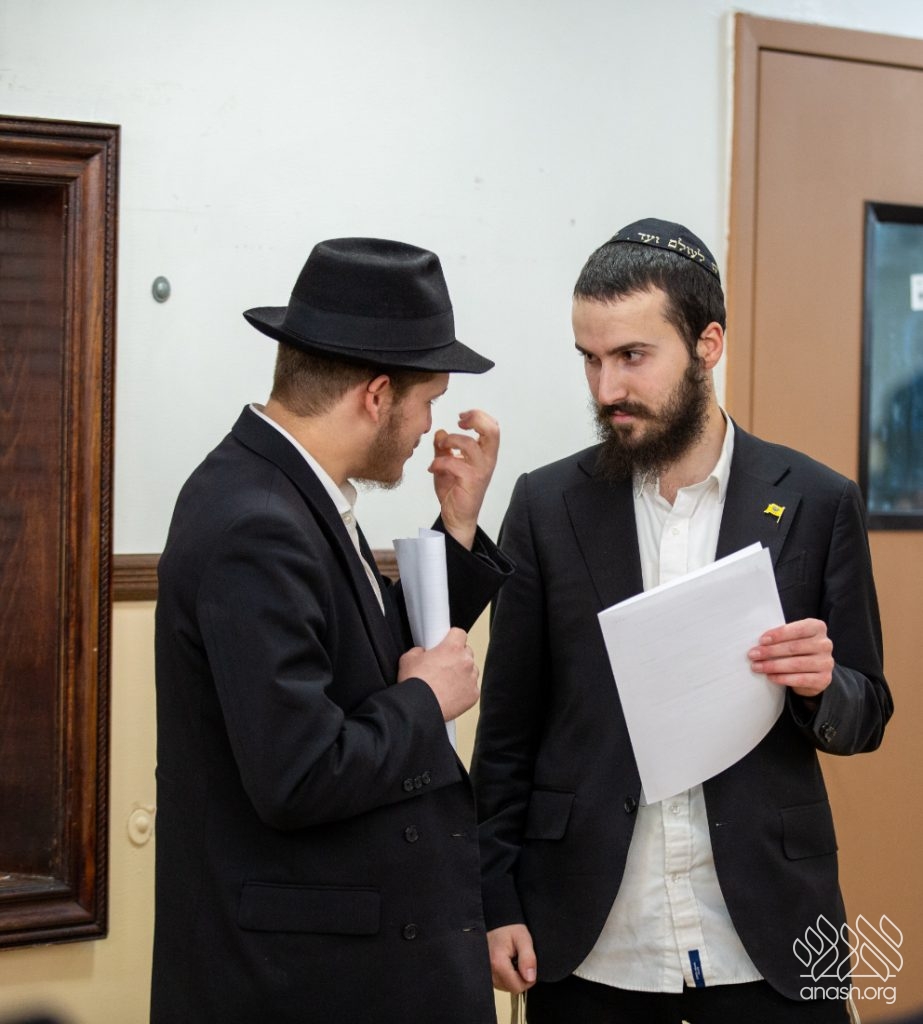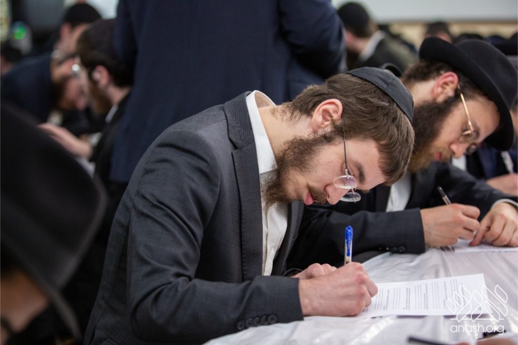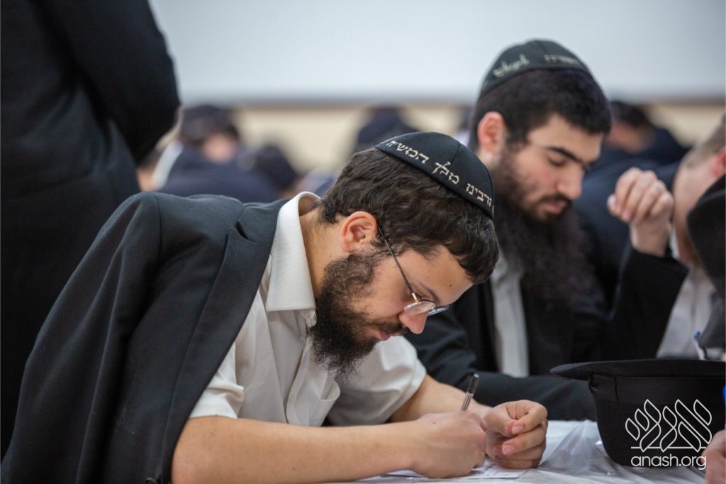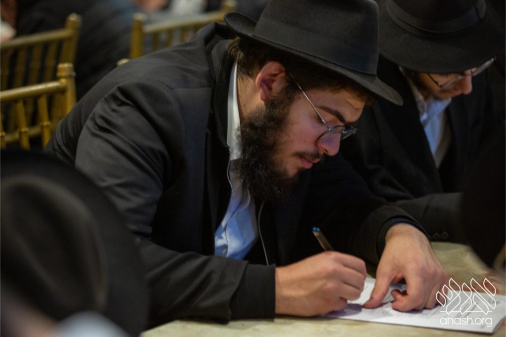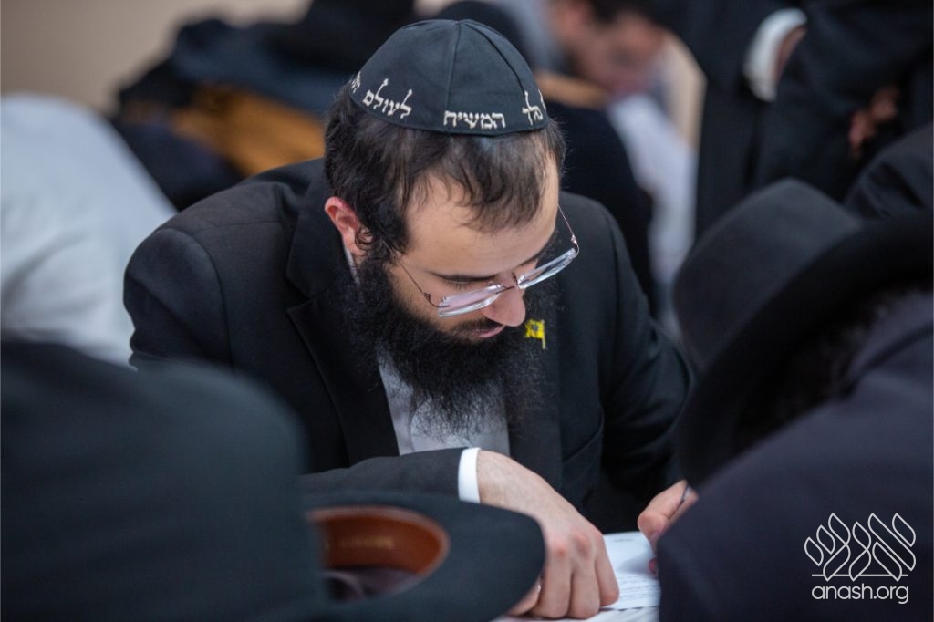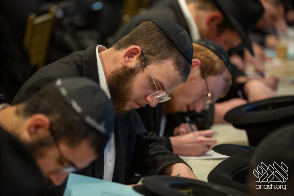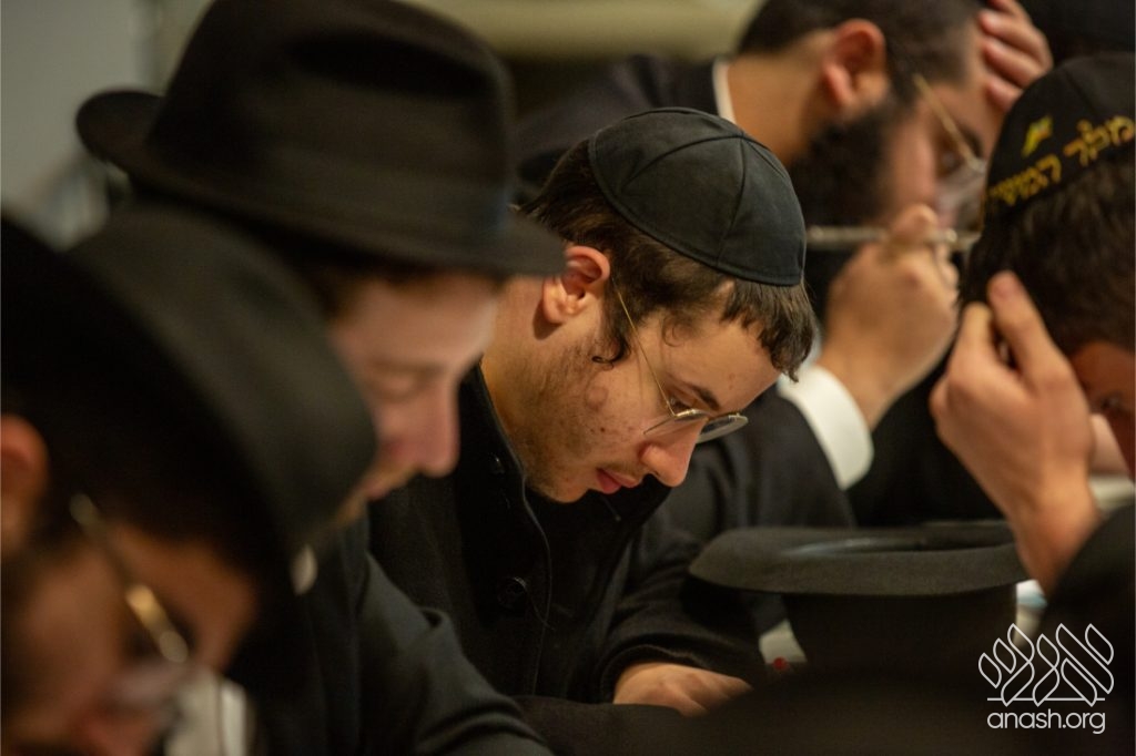 The monthly test, held on Thursday, revealed the impressive scope of participation. The dining room, which in previous years sufficed for all the bochurim, was filled to capacity. As a result, an additional testing location was opened at the Eshel Hotel, where all participants in the halacha track gathered. In both locations combined, a crowd was recorded unlike anything seen before, with long rows of temimim laboring over the test papers, investing effort and being precise in every detail.