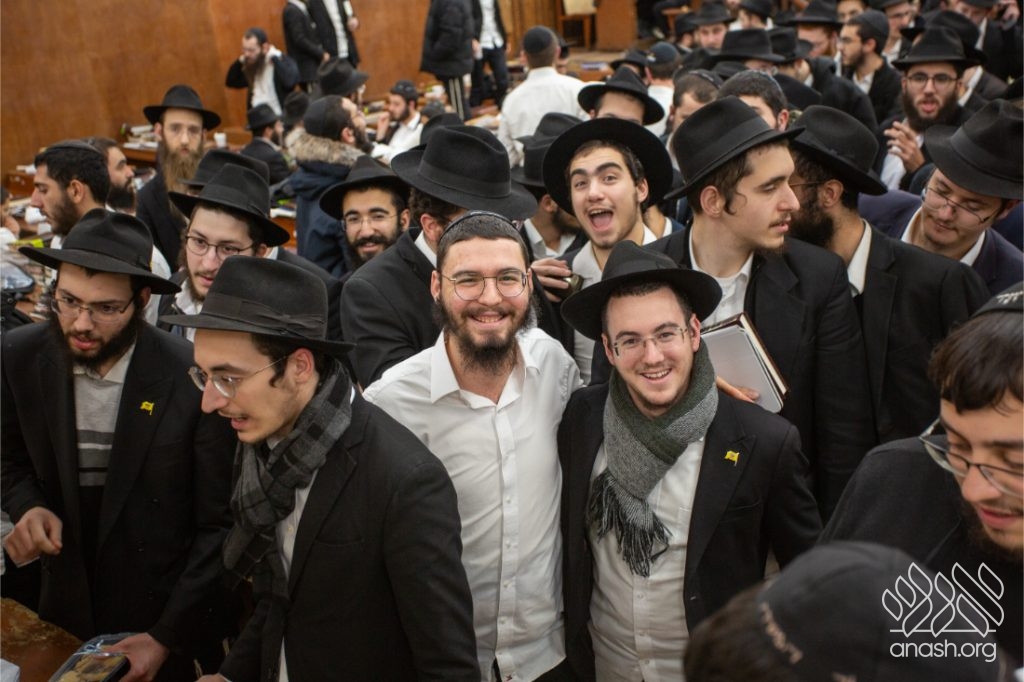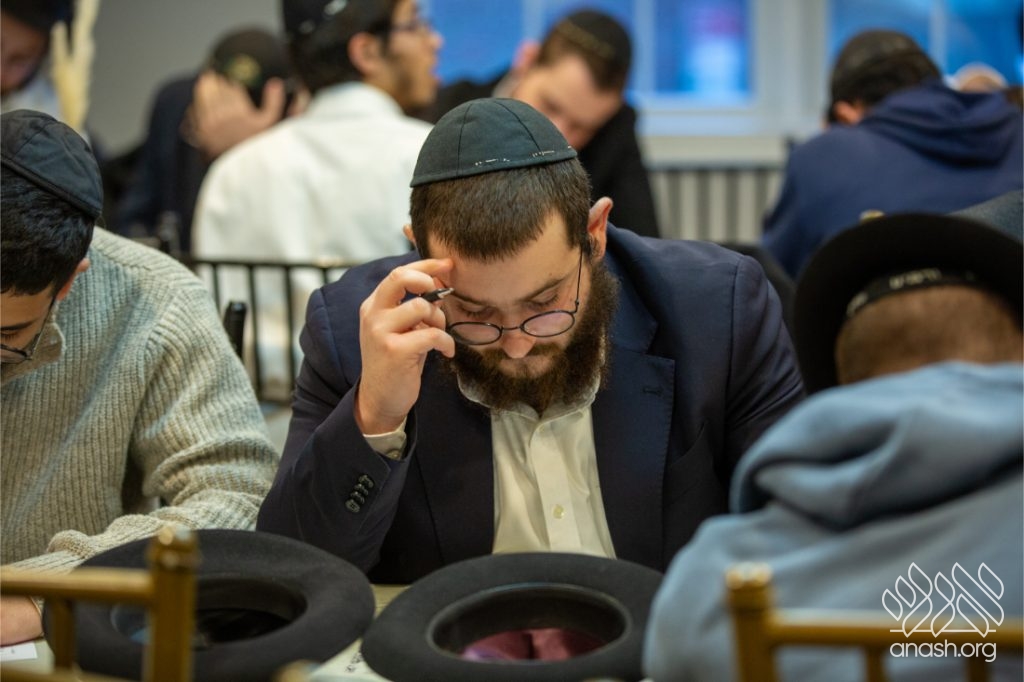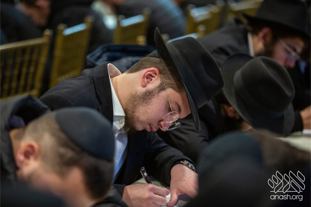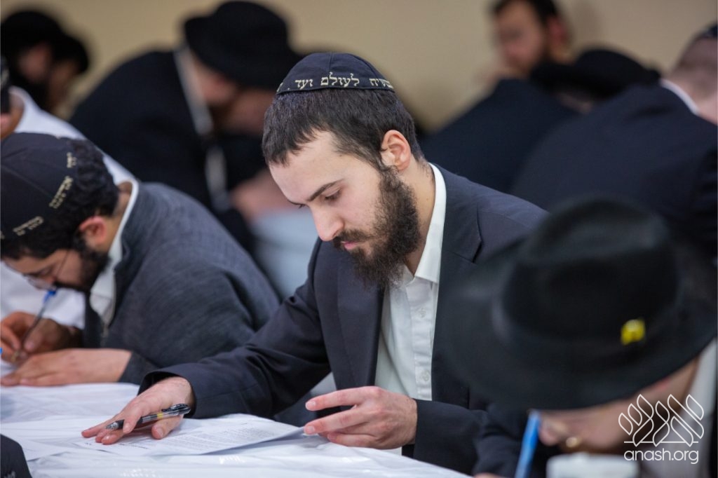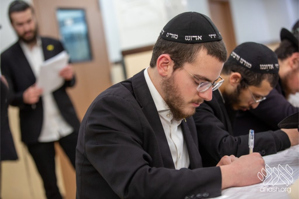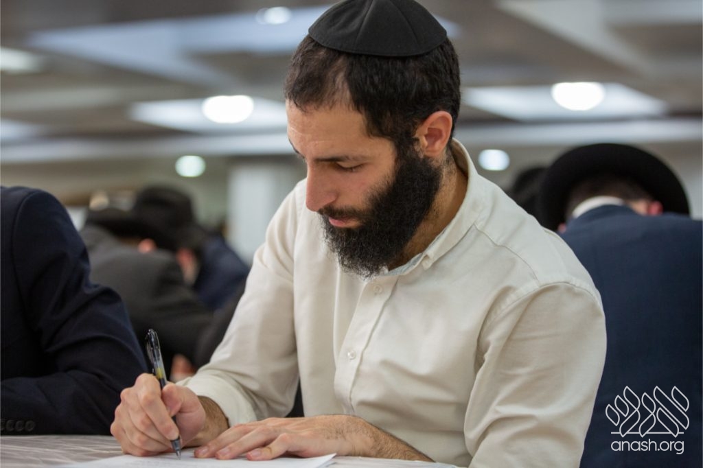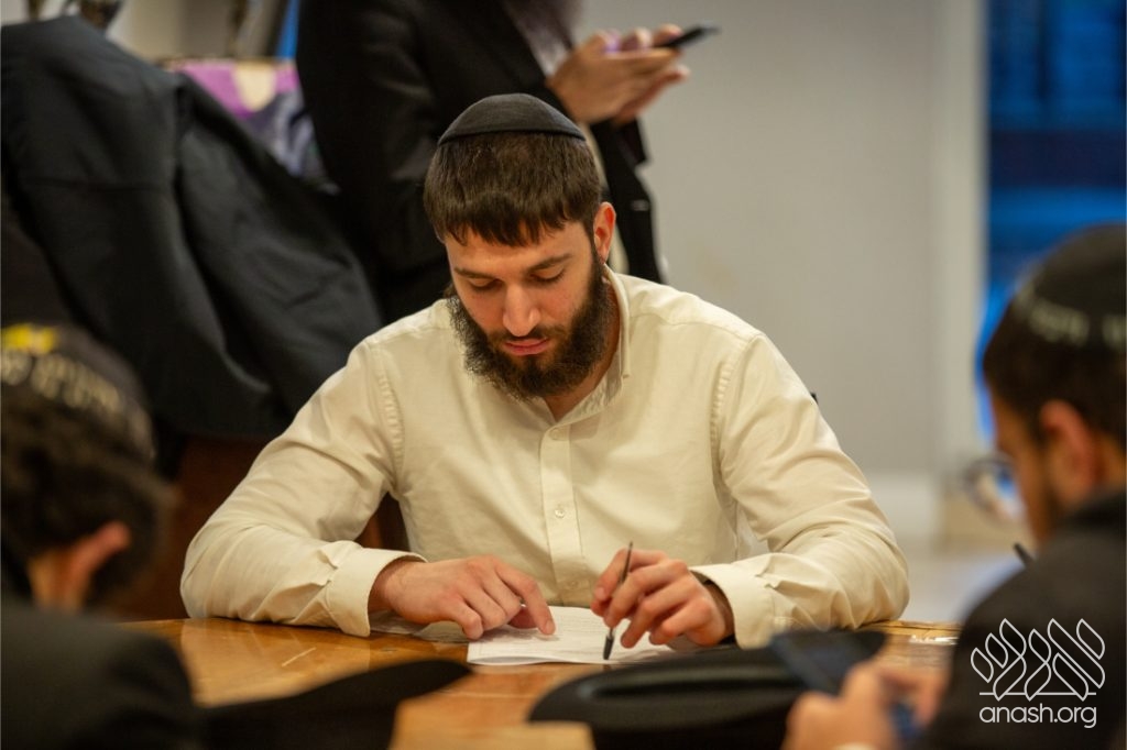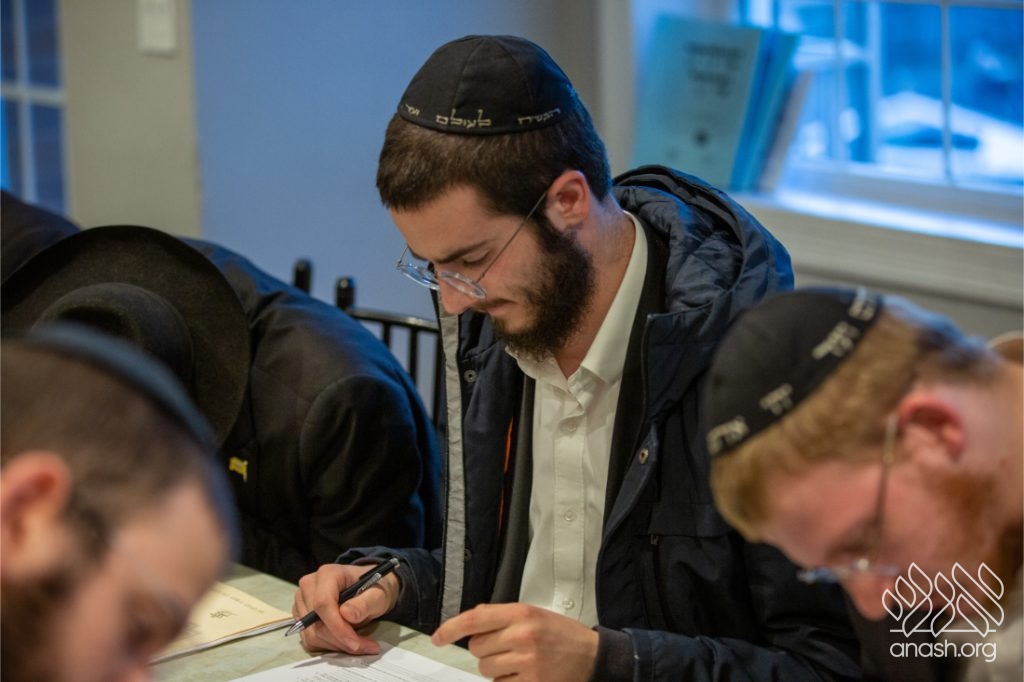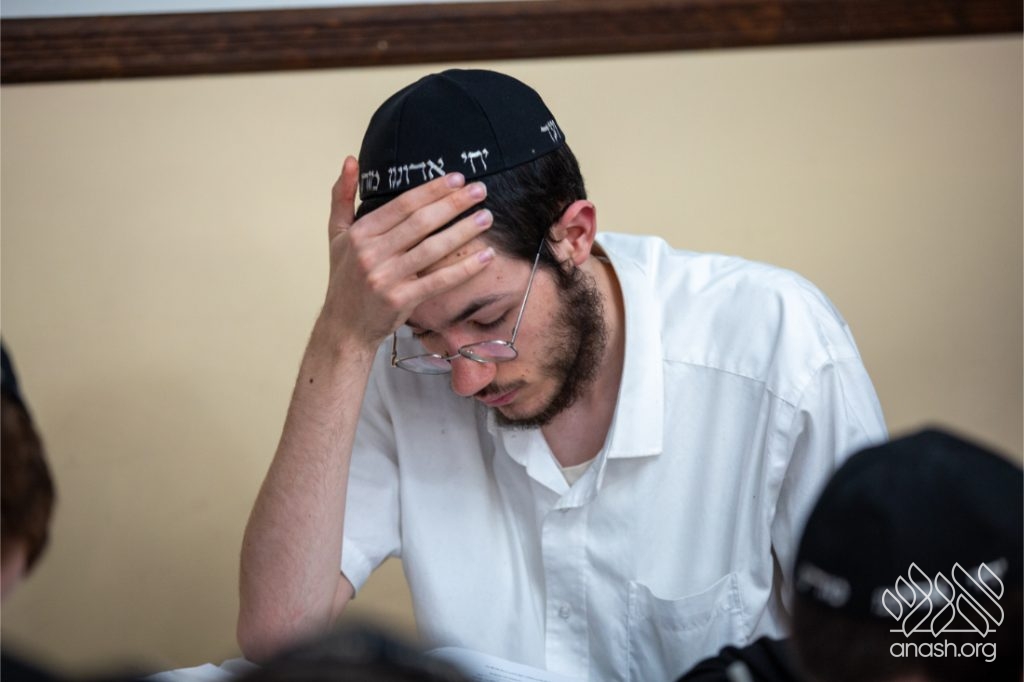 The monthly test, held on Thursday, revealed the impressive scope of participation. The dining room, which in previous years sufficed for all the bochurim, was filled to capacity. As a result, an additional testing location was opened at the Eshel Hotel, where all participants in the halacha track gathered. In both locations combined, a crowd was recorded unlike anything seen before, with long rows of temimim laboring over the test papers, investing effort and being precise in every detail.