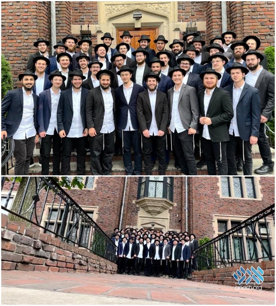 Alumni of Yeshiva Ohr Elchonon Chabad of Los Angeles who spent the past year learning in Oholei Torah Shiur Daled posed for a group photo in front of 770 before heading out on shlichus to yeshivos around the world.