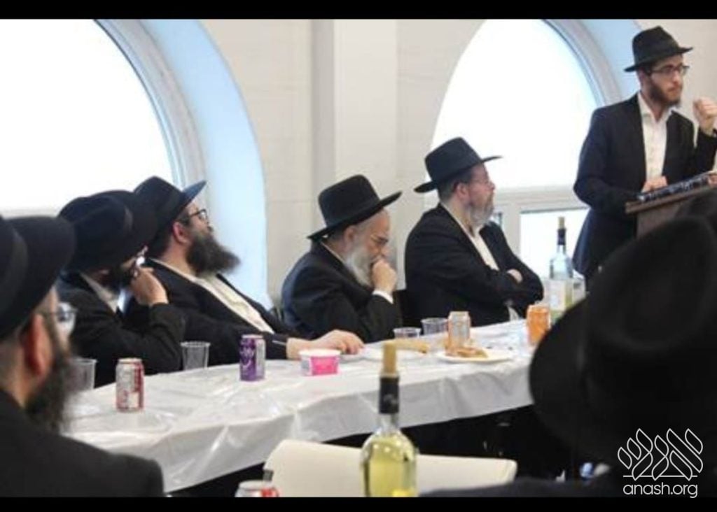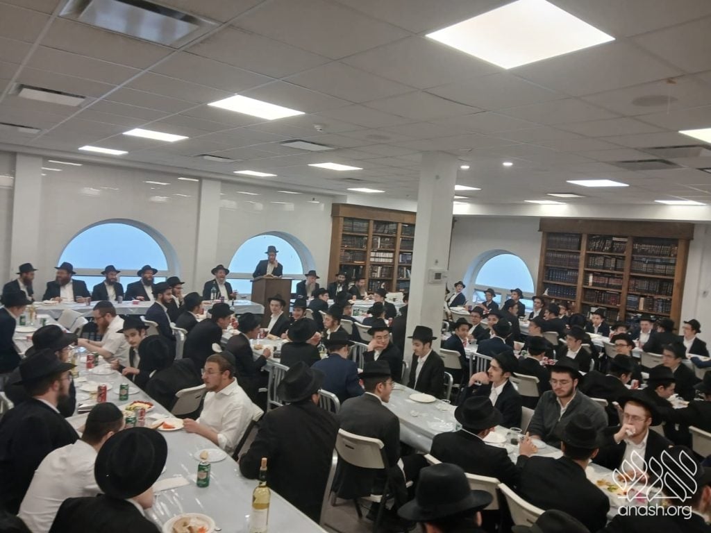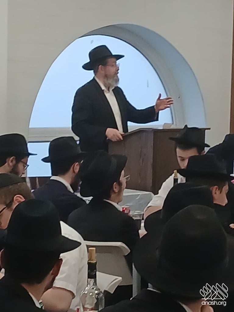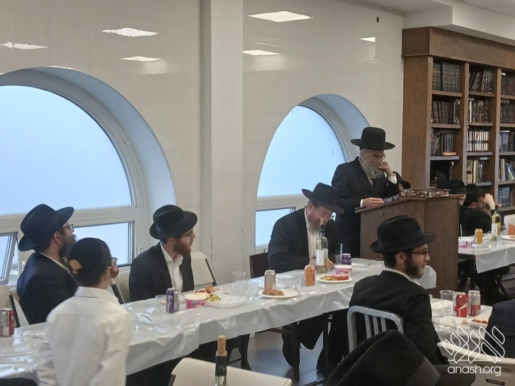 Rabbi Rappaport, mashpia in Mesivta, expounded on the meaning of “אשרי מי שבא לכאן ותלמודו בידו” – including literally having a Gemara in hand – and the unique emphasis of Chassidus that even one who has all of talmudo biyado should be a מי with bitul.