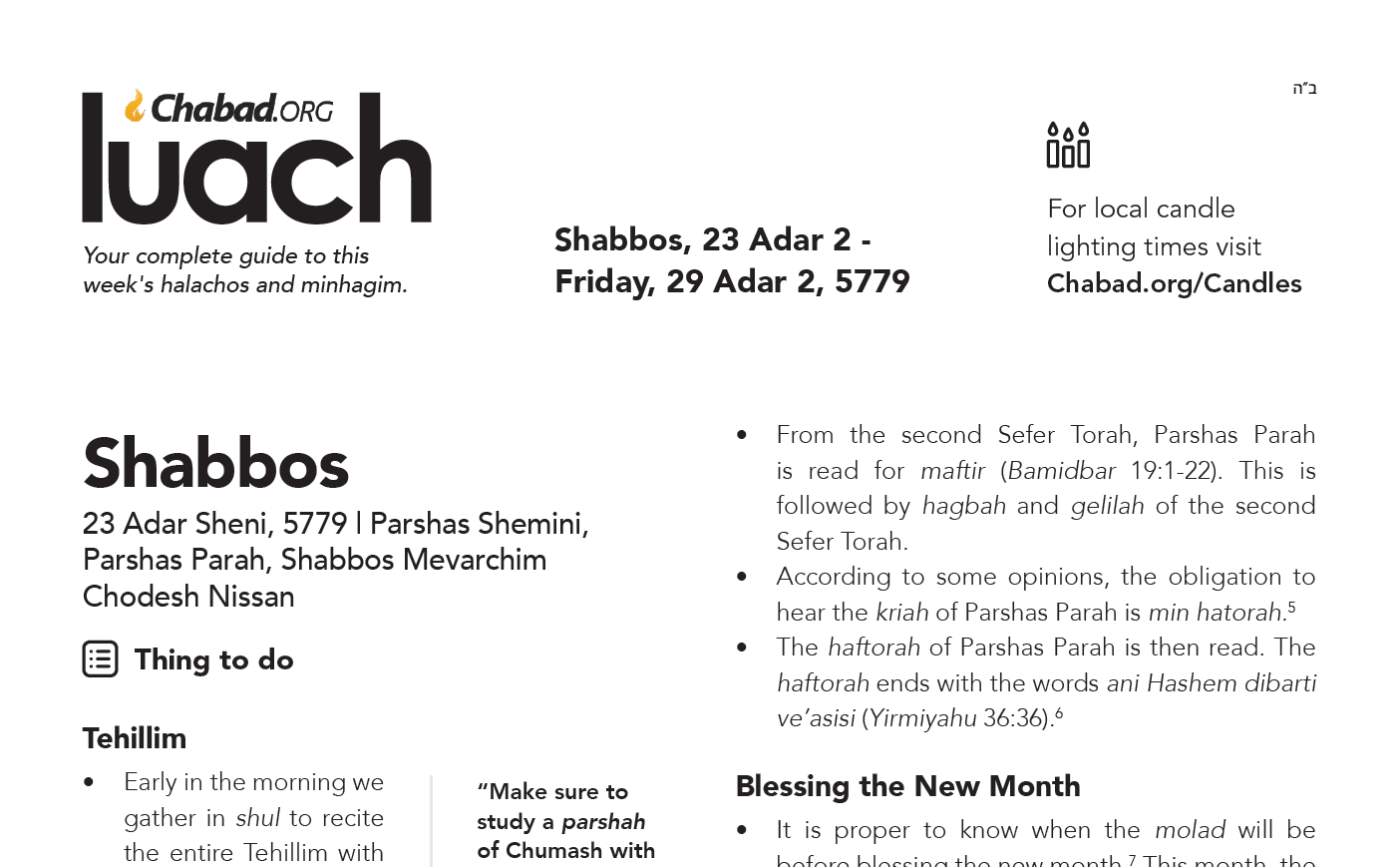 The Weekly Luach by Chabad.org tells you exactly what’s coming and what you need to do. Download it here on Anash.org.