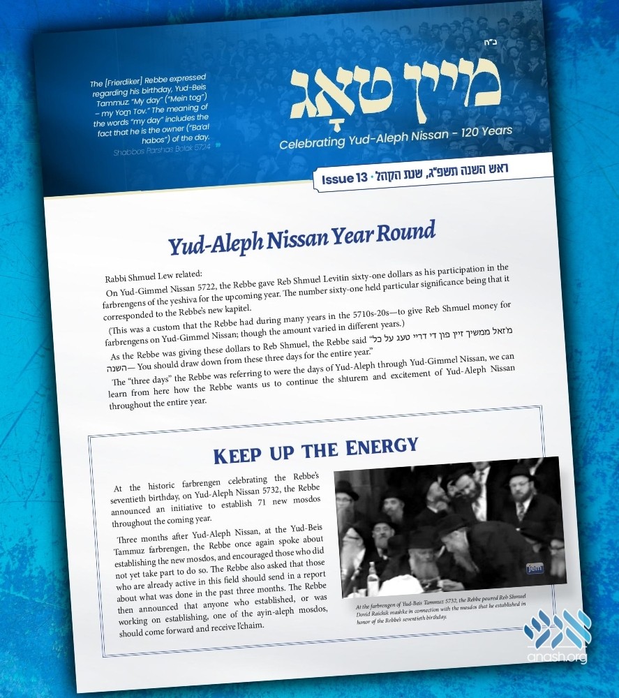 At the request of many Yeshivos and Talmidim Hashluchim, the acclaimed ‘Mein Tog’ weekly English publication published by the Vaad Talmidei Hatmimim Haolami in the weeks leading up to Yud-Alef Nissan – 120 years and distributed amongst the Yeshivos, is returning for the month of Tishrei.