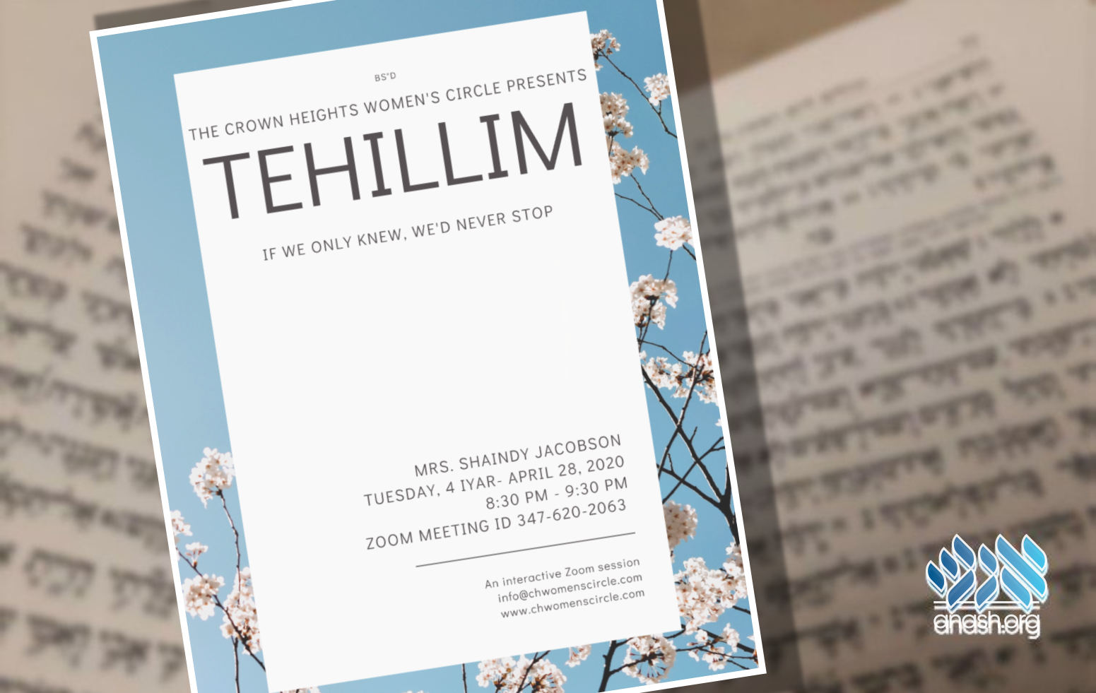 With the physical doors of the Crown Heights Women’s Circle closed, N’shei Chabad will gather virtually to explore the incredible power of Tehillim with Mrs. Shaindy Jacobson.